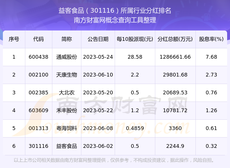 按照南方財(cái)富網(wǎng)趨勢選股系統(tǒng)統(tǒng)計(jì),益客食品所屬行業(yè)為食品行業(yè),食品行業(yè)分紅排名情況如下表: