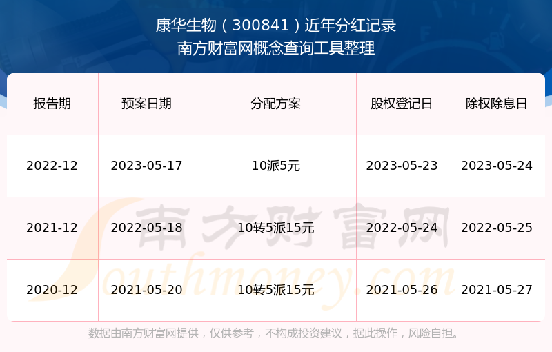 康華生物最新一次公布的分紅方案為10派5元。本次權(quán)益分派股權(quán)登記日為2023年5月23日,除權(quán)除息日為2023年5月24日,派息日為2023年5月24日。