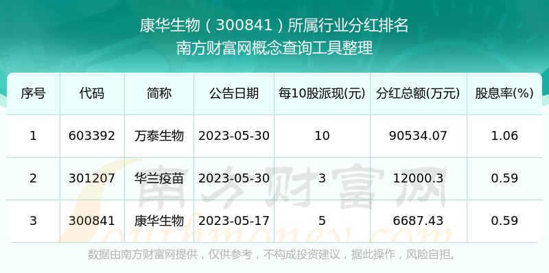 按照南方財(cái)富網(wǎng)趨勢(shì)選股系統(tǒng)統(tǒng)計(jì),康華生物所屬行業(yè)為疫苗行業(yè),疫苗行業(yè)分紅排名情況如下表: