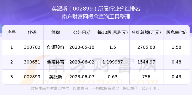 按照南方財(cái)富網(wǎng)趨勢(shì)選股系統(tǒng)統(tǒng)計(jì),英派斯所屬行業(yè)為體育健身行業(yè),體育健身行業(yè)分紅排名情況如下表: