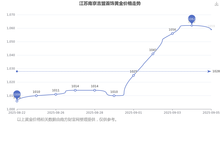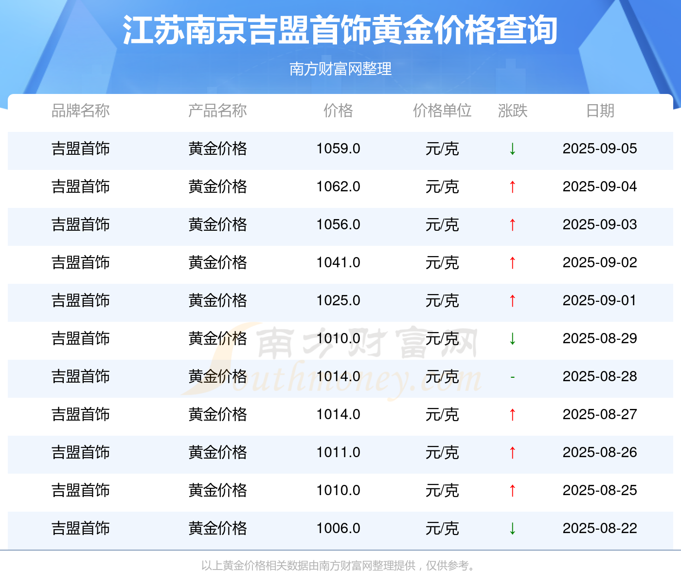 2025年9月6日江蘇南京吉盟首飾黃金價(jià)格:1059.0元/克。