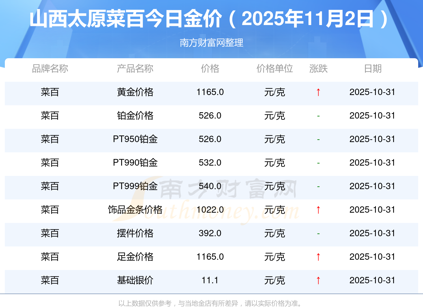 當下黃金每克的價格是多少呢?2025年11月2日山西太原菜百黃金一克的市場行情價是多少?黃金價格1198.0元/克,鉑金價格650.0元/克,飾品金價(內(nèi)地)1198.0元/克,黃金飾品(香港)44660.0,鉑金價格(香港)18640.0,金條價格(香港)40080.0,金條金價(內(nèi)地)1058.0元/克,黃金價格1200.0元/克,鉑金價格560.0元/克,足金價格1200.0元/克,黃金價格1135.0元/克。