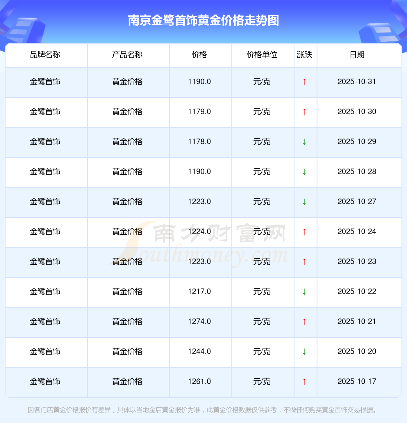 2025年11月2日各大金店黃金價格最新價格:周大福1198.0元/克,周大福650.0元/克,周大福1198.0元/克,周大福44660.0,周大福18640.0,周大福40080.0,周大福1058.0元/克,老鳳祥1200.0元/克,老鳳祥560.0元/克,老鳳祥1200.0元/克,周六福1135.0元/克。