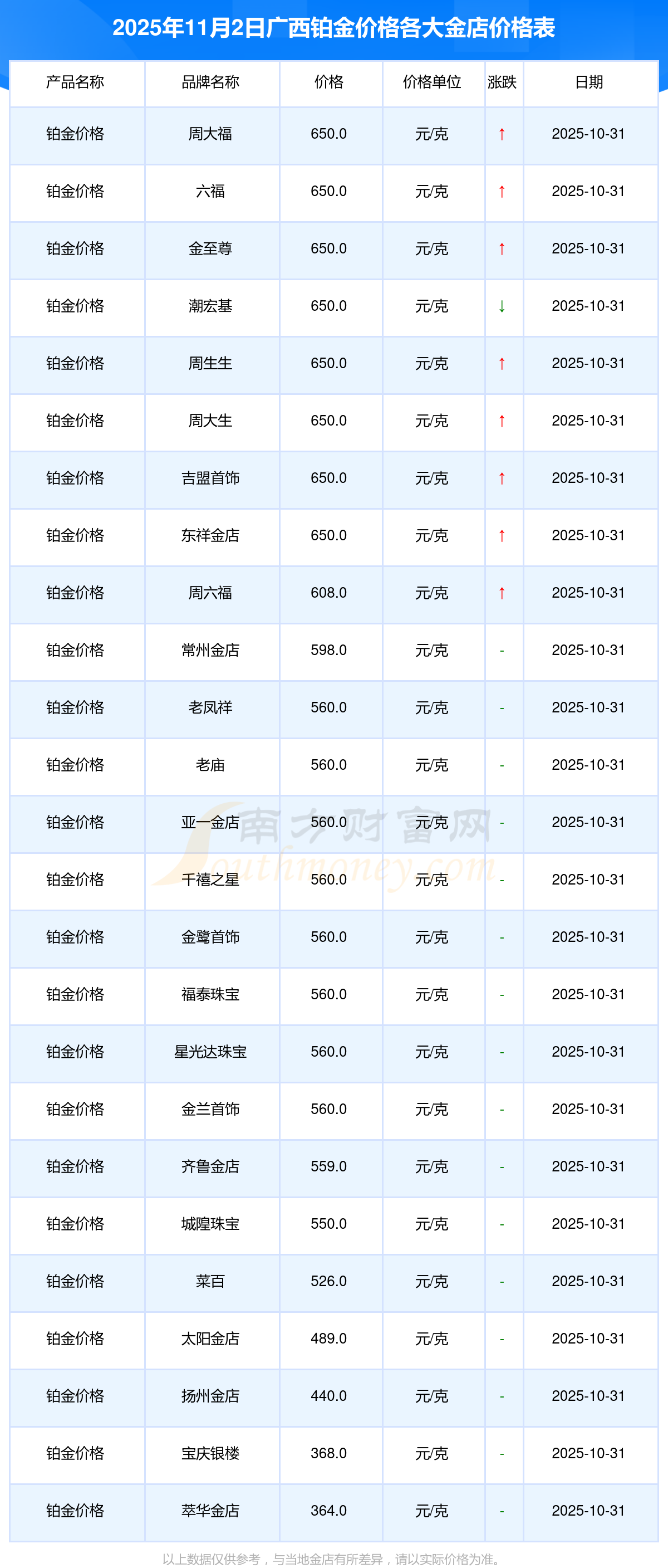 一、廣西各金店鉑金價(jià)格表來(lái)了