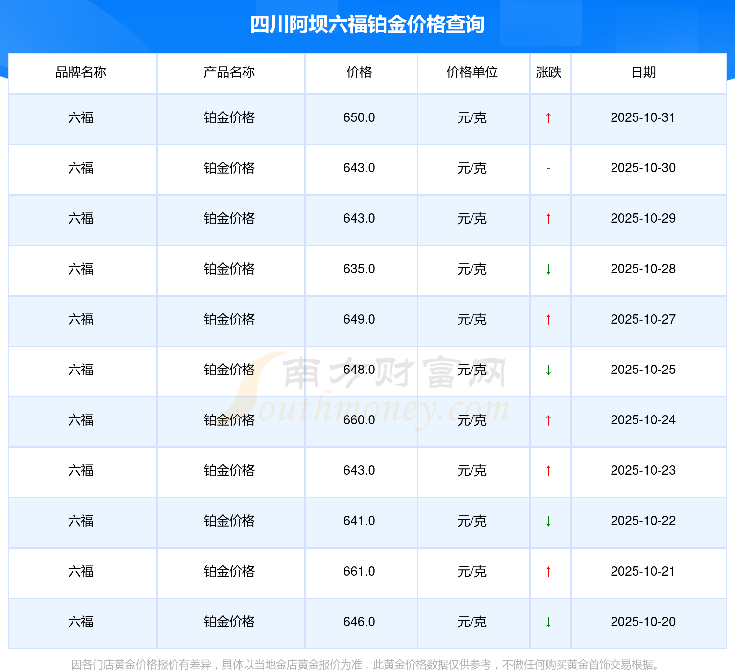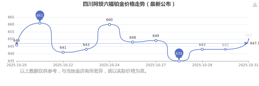 2025年11月2日四川阿壩六福鉑金價(jià)格:650.0元/克。