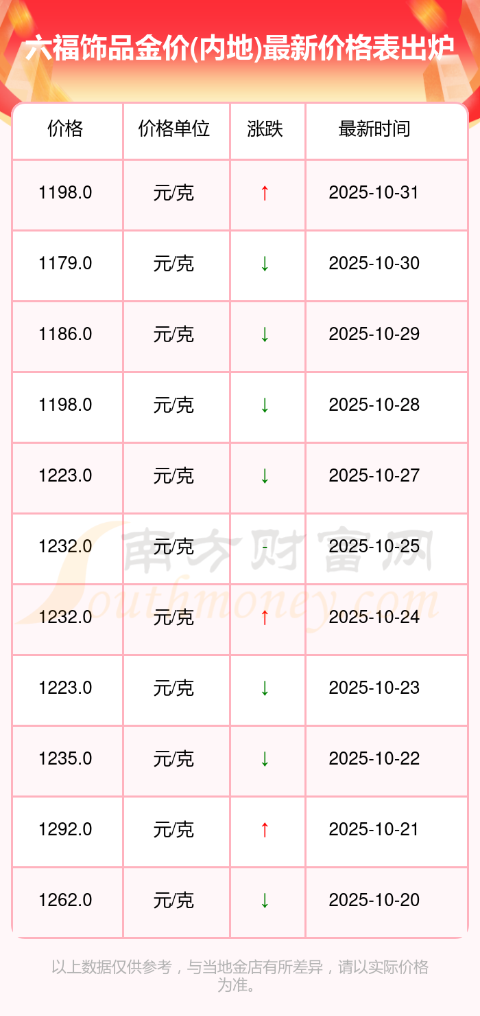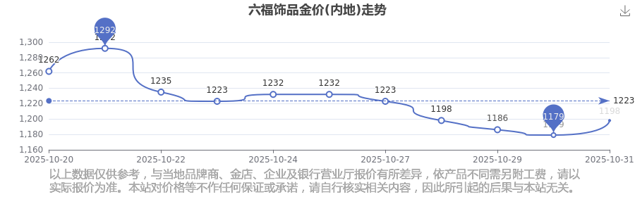 六福今日飾品金價(jià)(內(nèi)地)的最新市場行情價(jià)為1198.0元/克。