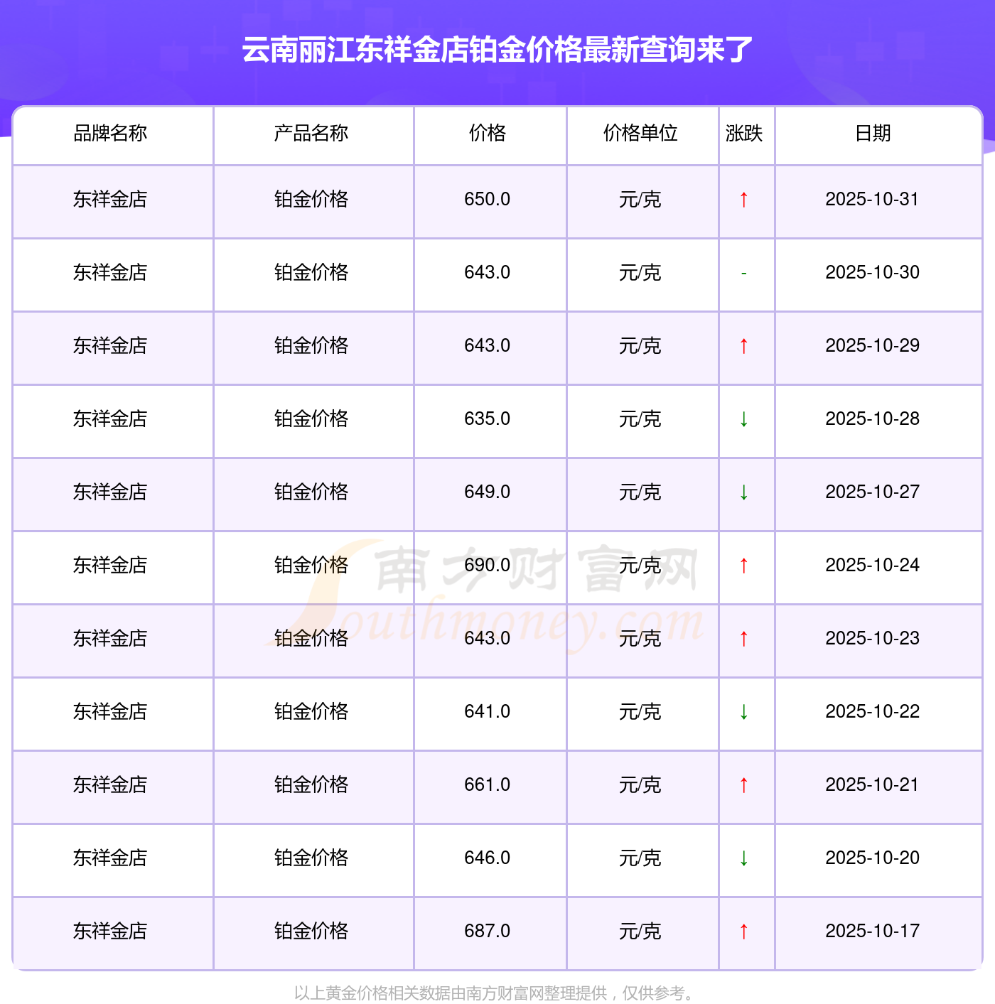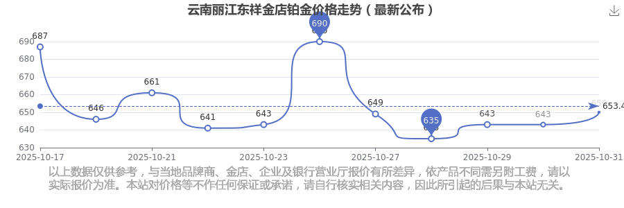 今日(2025年11月2日)云南麗江東祥金店鉑金價(jià)格:650.0元/克。