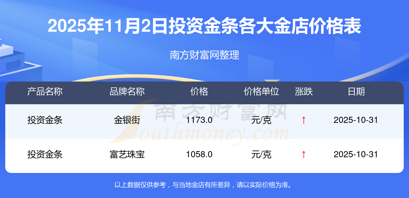 2025年11月2日各大金店投資金條最新價格:周大福1198.0元/克,周大福650.0元/克,周大福1198.0元/克,周大福44660.0,周大福18640.0,周大福40080.0,周大福1058.0元/克,老鳳祥1200.0元/克,老鳳祥560.0元/克,老鳳祥1200.0元/克,周六福1135.0元/克。