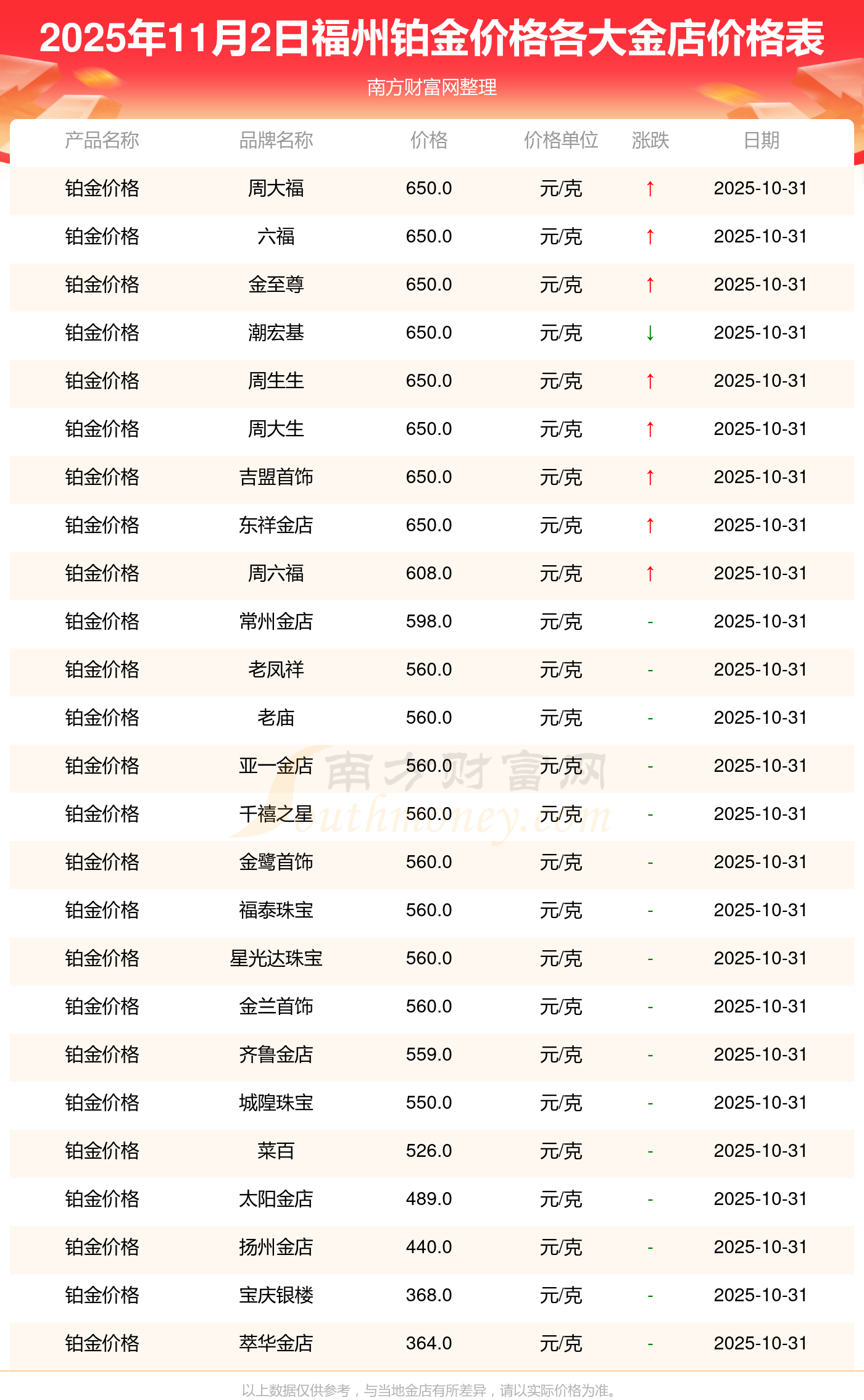 2025年11月2日福州周大福、周大福、周大福、周大福、周大福、周大福、周大福、老鳳祥、老鳳祥、老鳳祥、周六福等各大金店品牌鉑金價格最新價格如下:周大福黃金價格1198.0元/克,周大福鉑金價格650.0元/克,周大福飾品金價(內(nèi)地)1198.0元/克,周大福黃金飾品(香港)44660.0,周大福鉑金價格(香港)18640.0,周大福金條價格(香港)40080.0,周大福金條金價(內(nèi)地)1058.0元/克,老鳳祥黃金價格1200.0元/克,老鳳祥鉑金價格560.0元/克,老鳳祥足金價格1200.0元/克,周六福黃金價格1135.0元/克。