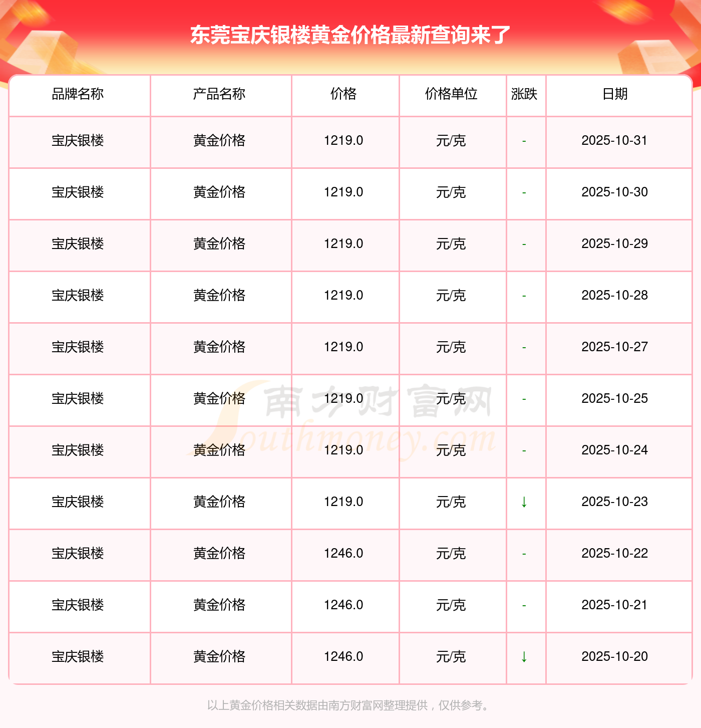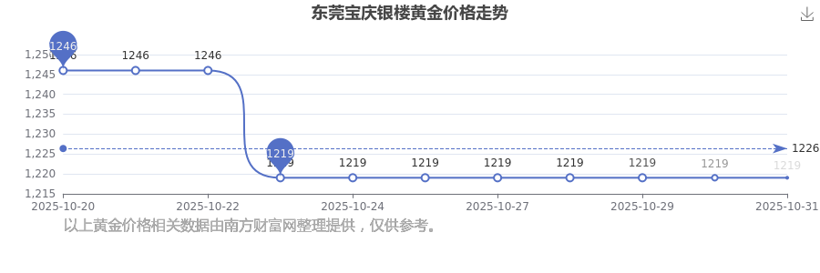 (2025年11月2日)今日東莞寶慶銀樓黃金價格是1219.0元/克。