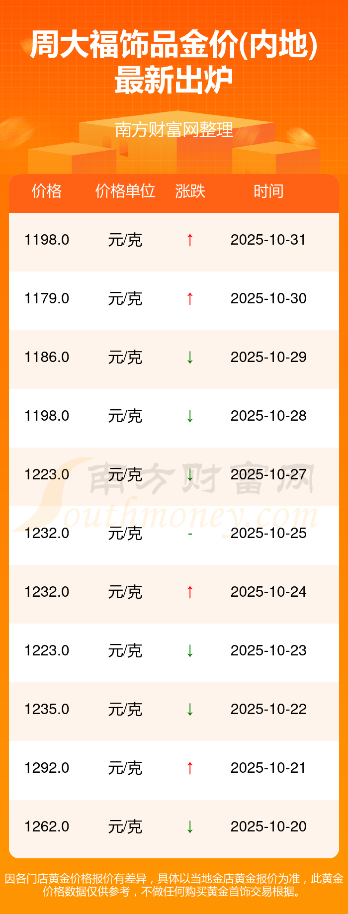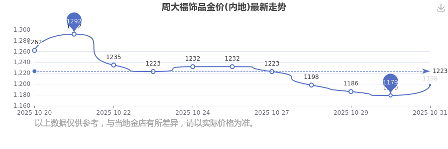 1198.0元/克的價(jià)格,是周大福今日 飾品金價(jià)(內(nèi)地)的最新行情。