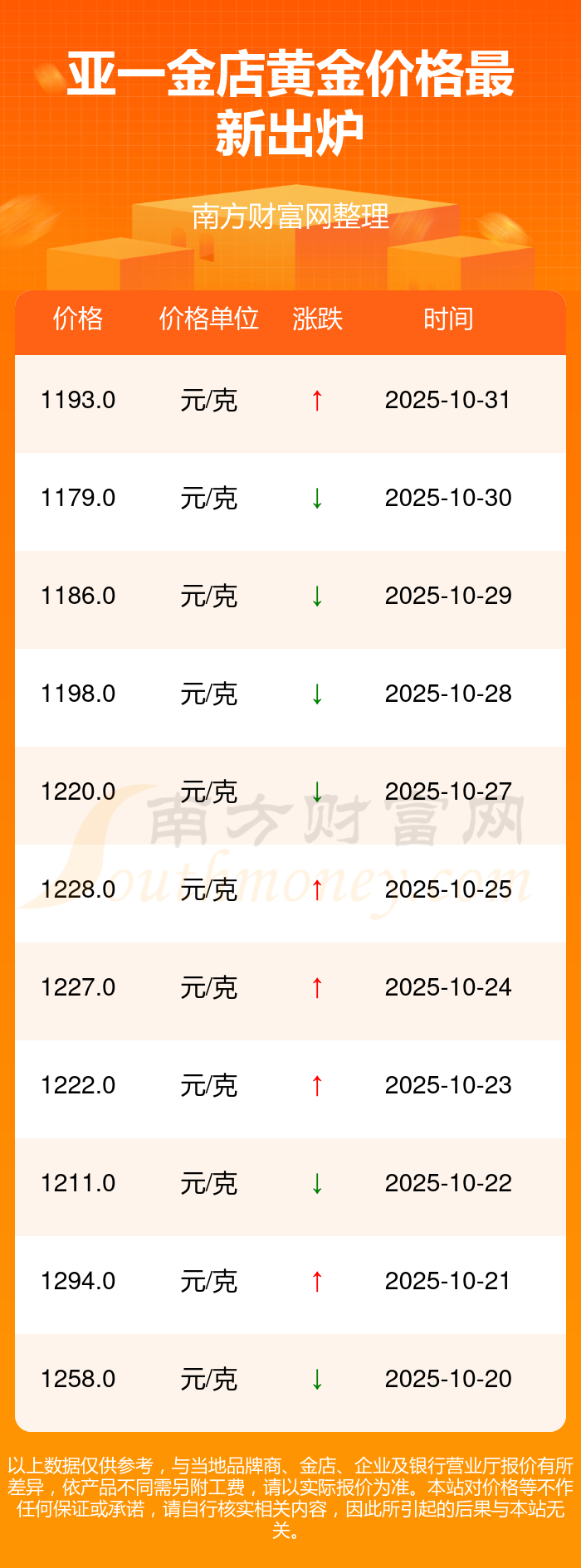 以上數(shù)據(jù)僅供參考,與當(dāng)?shù)仄放粕、金店、企業(yè)及銀行營業(yè)廳報(bào)價(jià)有所差異,依產(chǎn)品不同需另附工費(fèi),請(qǐng)以實(shí)際報(bào)價(jià)為準(zhǔn)。本站對(duì)價(jià)格等不作任何保證或承諾,請(qǐng)自行核實(shí)相關(guān)內(nèi)容,因此所引起的后果與本站無關(guān)。