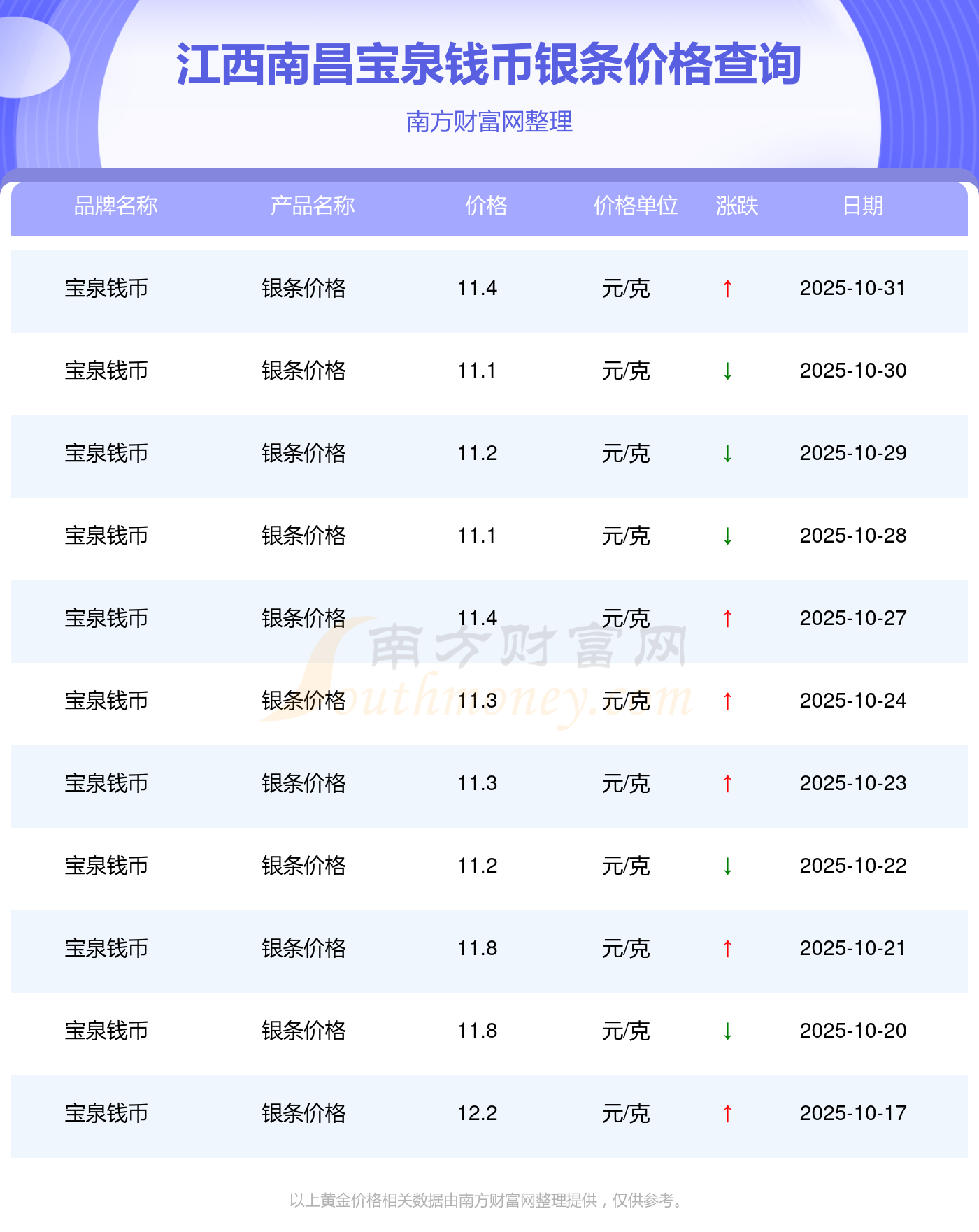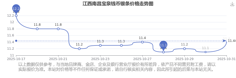 于 2025年11月2日,江西南昌寶泉錢(qián)幣銀條價(jià)格的克價(jià)為11.4元/克。