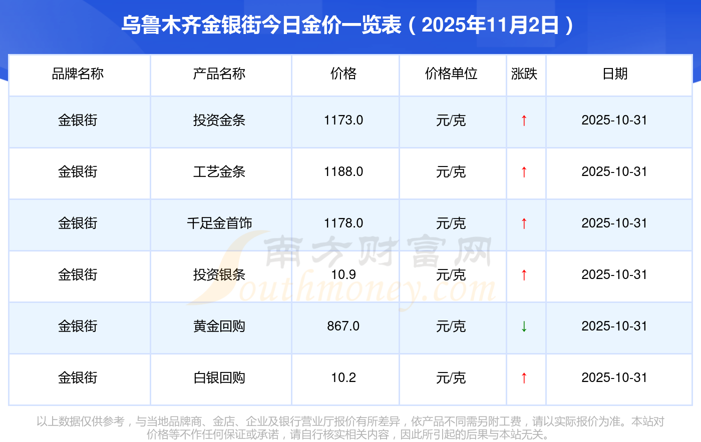 2025年11月2日烏魯木齊金銀街現(xiàn)在黃金一克要多少錢:黃金價格1198.0元/克,鉑金價格650.0元/克,飾品金價(內地)1198.0元/克,黃金飾品(香港)44660.0,鉑金價格(香港)18640.0,金條價格(香港)40080.0,金條金價(內地)1058.0元/克,黃金價格1200.0元/克,鉑金價格560.0元/克,足金價格1200.0元/克,黃金價格1135.0元/克。