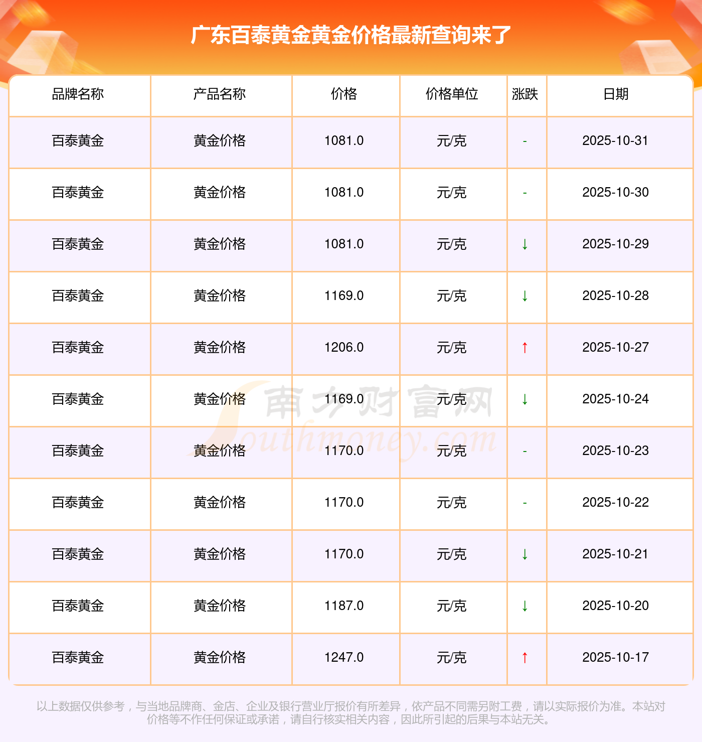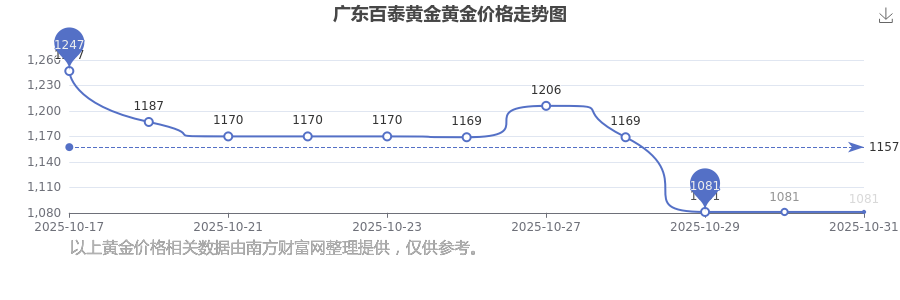 廣東百泰黃金黃金價格在 2025年11月2日,其市場價格為 1081.0元/克。