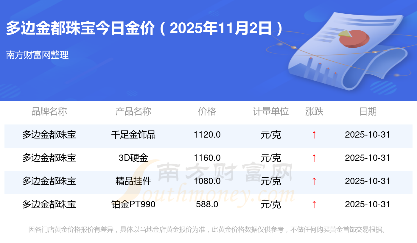 2025年11月2日多邊金都珠寶最新價(jià)格:黃金價(jià)格1198.0元/克,鉑金價(jià)格650.0元/克,飾品金價(jià)(內(nèi)地)1198.0元/克,黃金飾品(香港)44660.0,鉑金價(jià)格(香港)18640.0,金條價(jià)格(香港)40080.0,金條金價(jià)(內(nèi)地)1058.0元/克,黃金價(jià)格1200.0元/克,鉑金價(jià)格560.0元/克,足金價(jià)格1200.0元/克,黃金價(jià)格1135.0元/克。