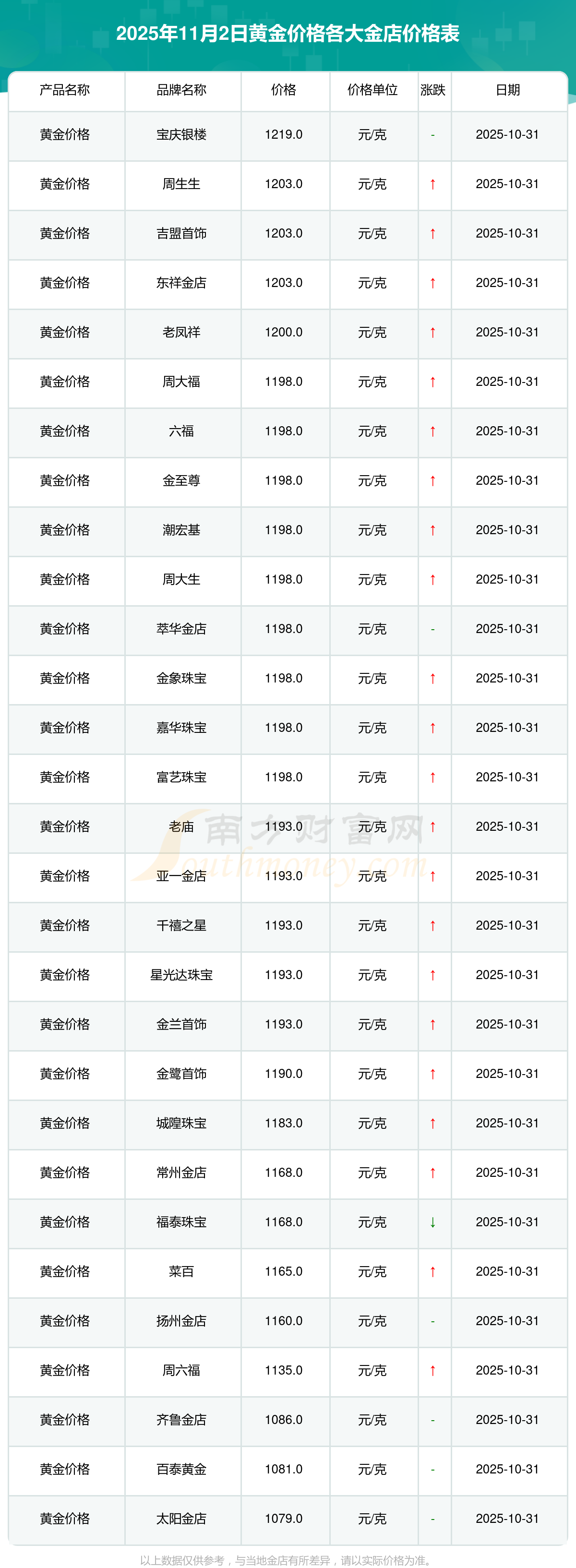 2025年11月2日各大金店黃金價(jià)格最新價(jià)格:周大福1198.0元/克,周大福650.0元/克,周大福1198.0元/克,周大福44660.0,周大福18640.0,周大福40080.0,周大福1058.0元/克,老鳳祥1200.0元/克,老鳳祥560.0元/克,老鳳祥1200.0元/克,周六福1135.0元/克。