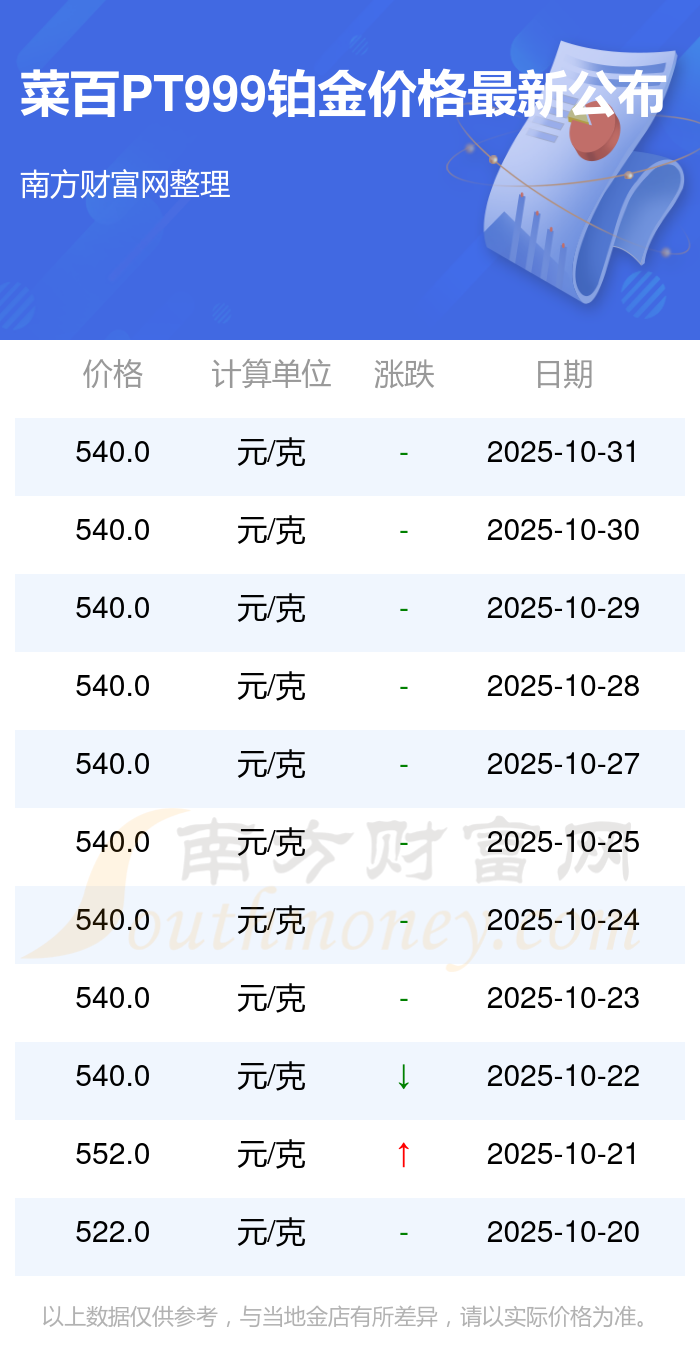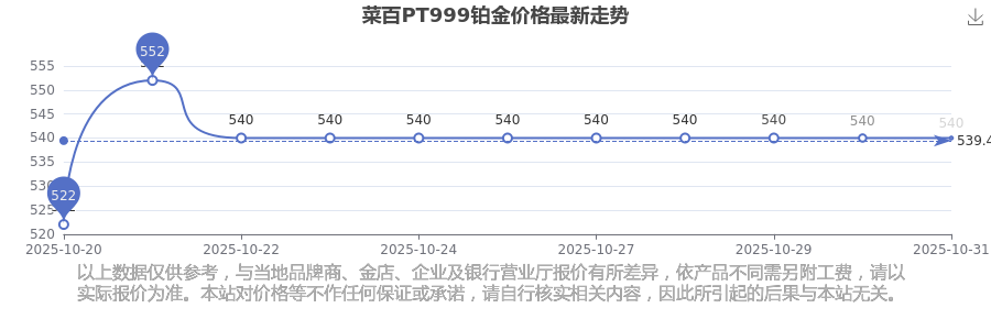 今日菜百 PT999鉑金的最新定價(jià)為540.0元/克。