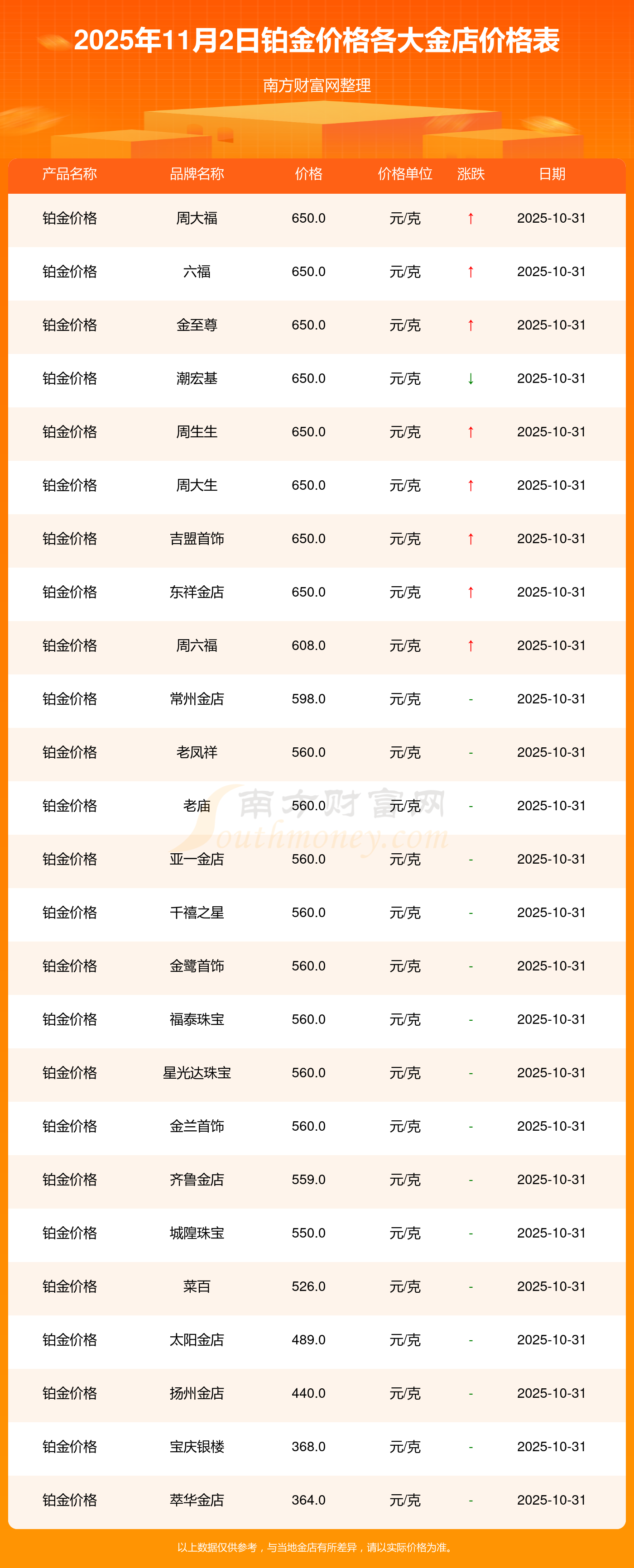 2025年11月2日,周大福、周大福、周大福、周大福、周大福、周大福、周大福、老鳳祥、老鳳祥、老鳳祥、周六福等各大金店品牌鉑金價格今日價格如下:周大福1198.0元/克、周大福650.0元/克、周大福1198.0元/克、周大福44660.0、周大福18640.0、周大福40080.0、周大福1058.0元/克、老鳳祥1200.0元/克、老鳳祥560.0元/克、老鳳祥1200.0元/克、周六福1135.0元/克。