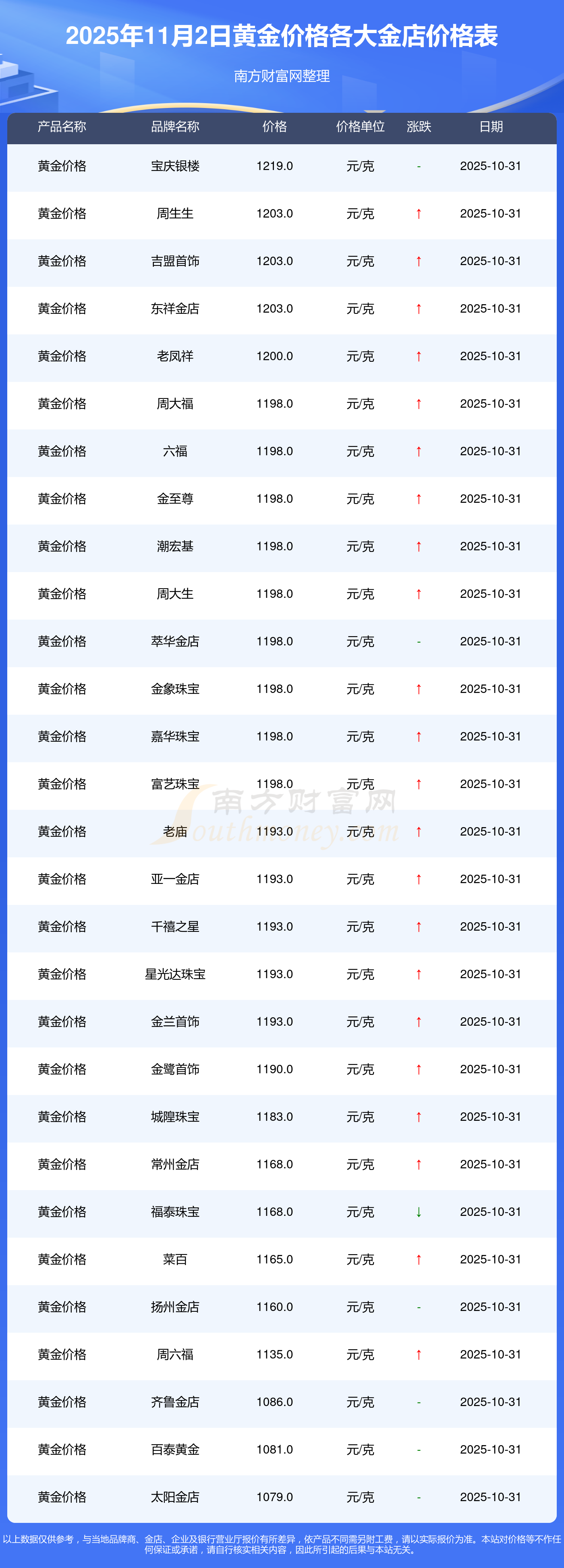 2025年11月2日各大金店黃金價(jià)格最新價(jià)格:周大福1198.0元/克,周大福650.0元/克,周大福1198.0元/克,周大福44660.0,周大福18640.0,周大福40080.0,周大福1058.0元/克,老鳳祥1200.0元/克,老鳳祥560.0元/克,老鳳祥1200.0元/克,周六福1135.0元/克。