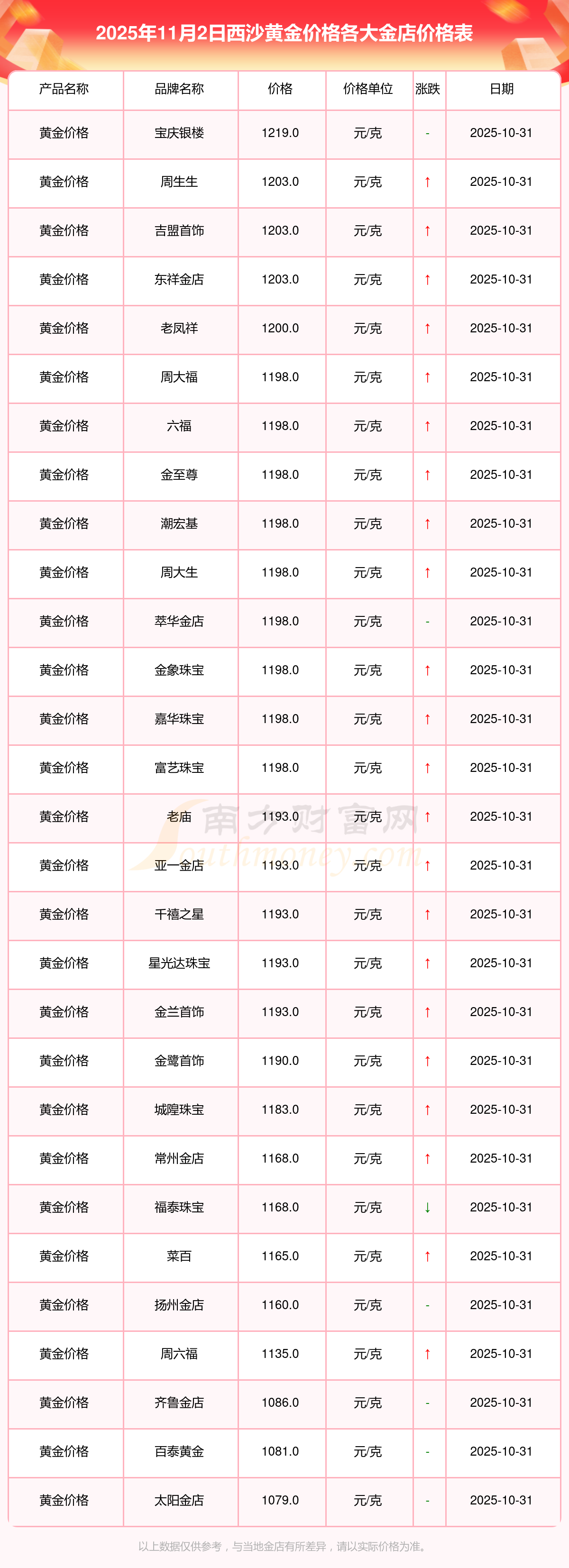 2025年11月2日,西沙周大福、周大福、周大福、周大福、周大福、周大福、周大福、老鳳祥、老鳳祥、老鳳祥、周六福等各大金店品牌黃金價格今日價格行情最新來了:周大福1198.0元/克、周大福650.0元/克、周大福1198.0元/克、周大福44660.0、周大福18640.0、周大福40080.0、周大福1058.0元/克、老鳳祥1200.0元/克、老鳳祥560.0元/克、老鳳祥1200.0元/克、周六福1135.0元/克。