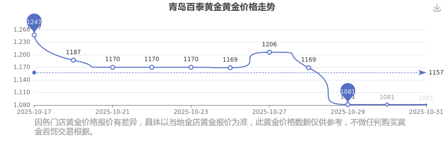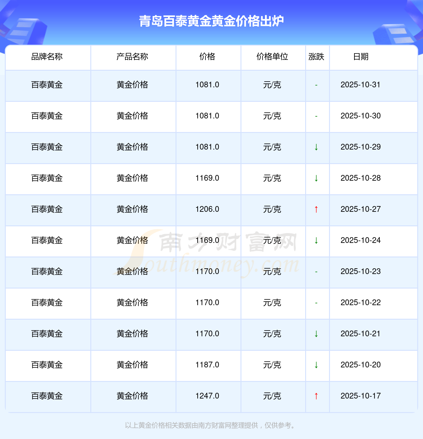 2025年11月2日,青島百泰黃金黃金價(jià)格每克的價(jià)值量定格在1081.0元/克。