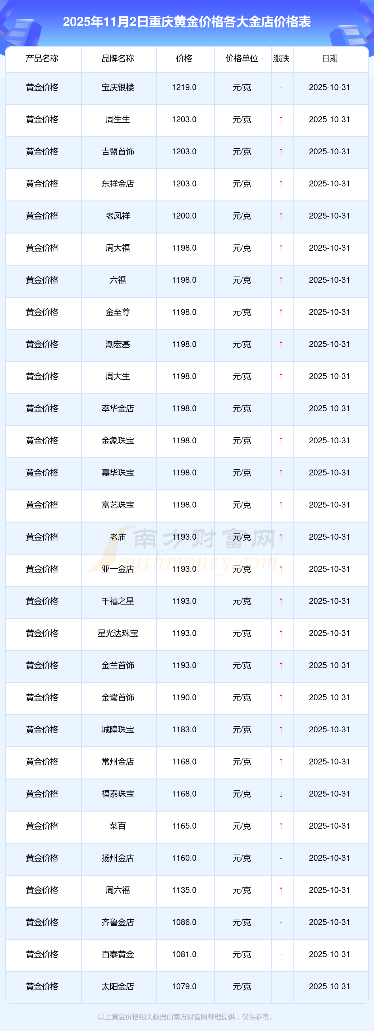 今天是2025年11月2日,重慶周大福、周大福、周大福、周大福、周大福、周大福、周大福、老鳳祥、老鳳祥、老鳳祥、周六福等各大金店品牌黃金價格最新價格如下:周大福1198.0元/克、周大福650.0元/克、周大福1198.0元/克、周大福44660.0、周大福18640.0、周大福40080.0、周大福1058.0元/克、老鳳祥1200.0元/克、老鳳祥560.0元/克、老鳳祥1200.0元/克、周六福1135.0元/克。