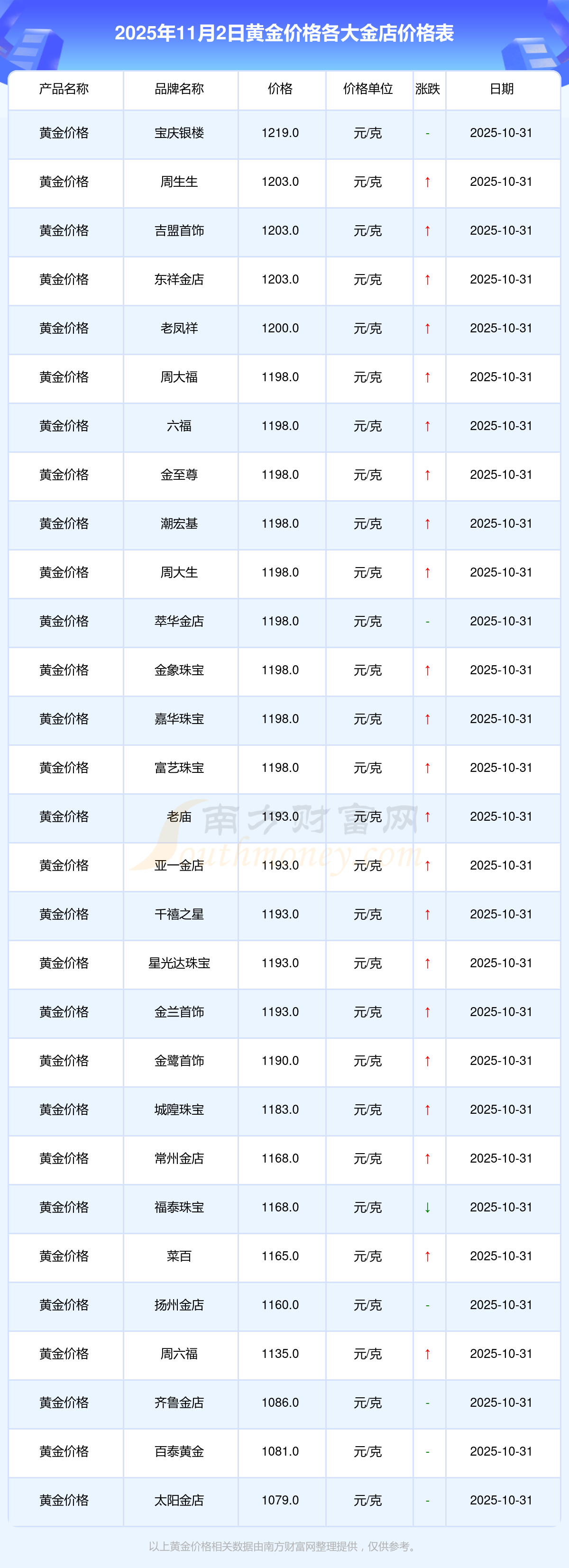 今天是2025年11月2日,周大福、周大福、周大福、周大福、周大福、周大福、周大福、老鳳祥、老鳳祥、老鳳祥、周六福等各大金店品牌黃金價(jià)格最新價(jià)格如下:周大福1198.0元/克、周大福650.0元/克、周大福1198.0元/克、周大福44660.0、周大福18640.0、周大福40080.0、周大福1058.0元/克、老鳳祥1200.0元/克、老鳳祥560.0元/克、老鳳祥1200.0元/克、周六福1135.0元/克。