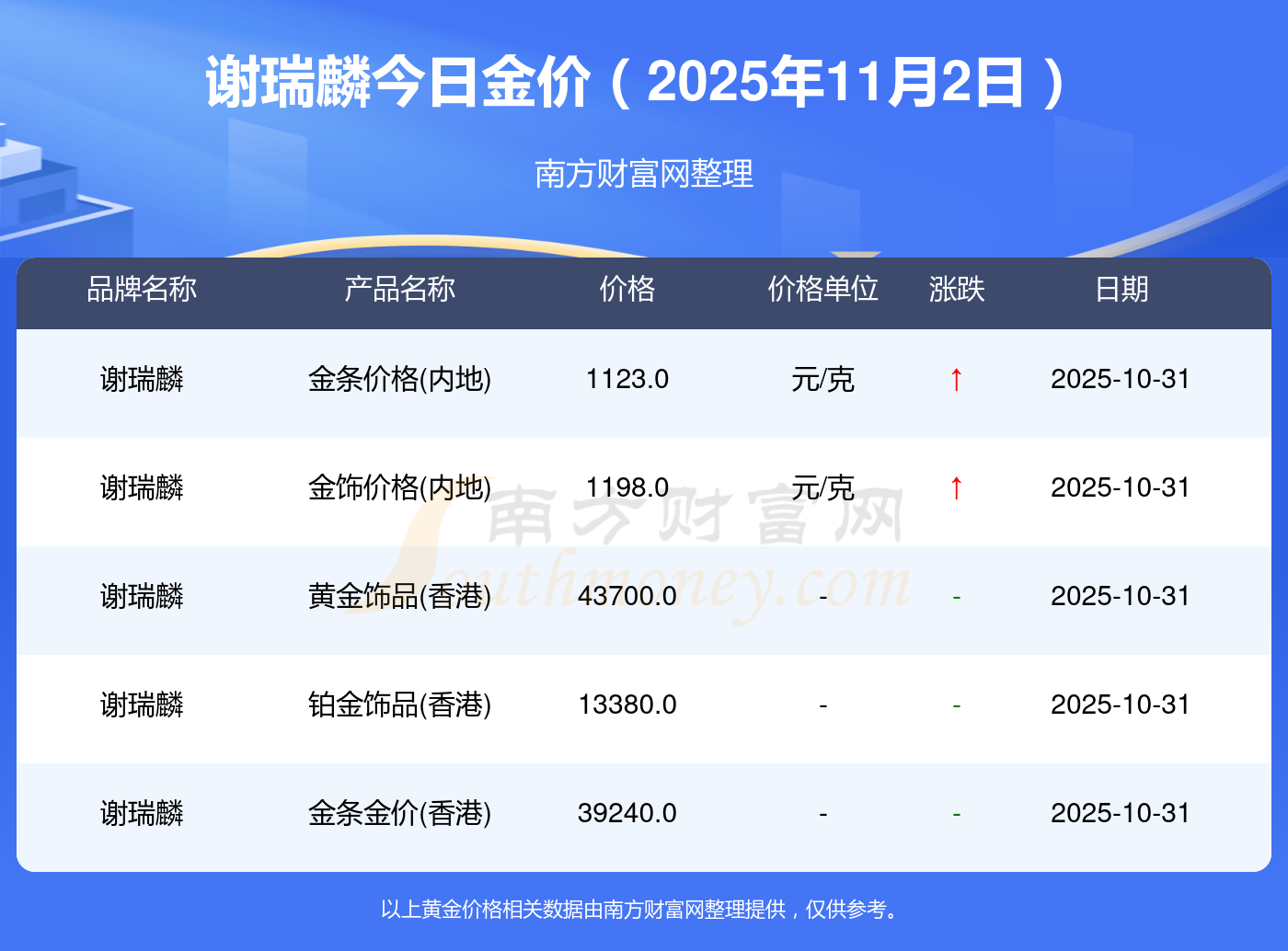 因各門店黃金價格報價有差異,具體以當?shù)亟鸬挈S金報價為準,此黃金價格數(shù)據(jù)僅供參考,不做任何購買黃金首飾交易根據(jù)。