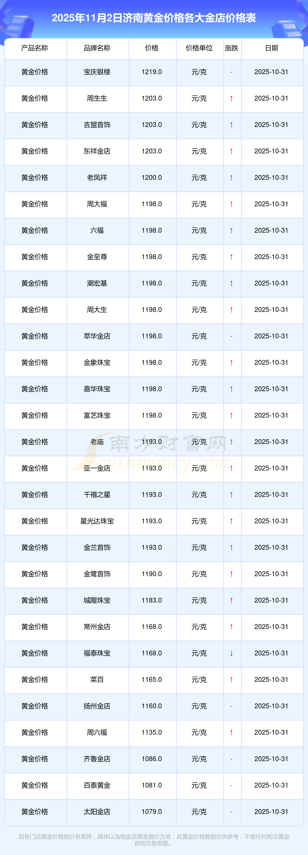 2025年11月2日濟(jì)南各大金店黃金價(jià)格最新價(jià)格:周大福1198.0元/克,周大福650.0元/克,周大福1198.0元/克,周大福44660.0,周大福18640.0,周大福40080.0,周大福1058.0元/克,老鳳祥1200.0元/克,老鳳祥560.0元/克,老鳳祥1200.0元/克,周六福1135.0元/克。