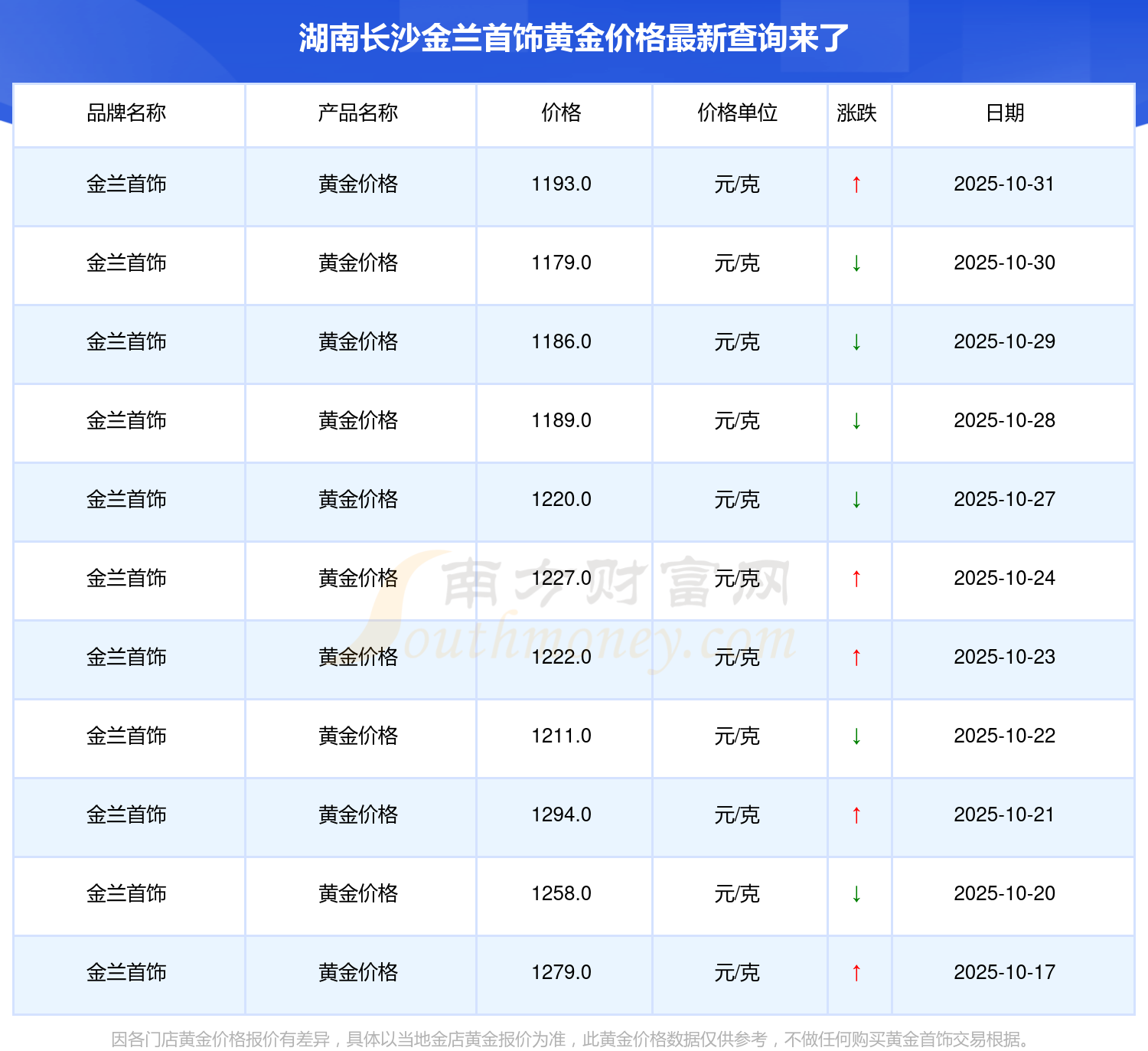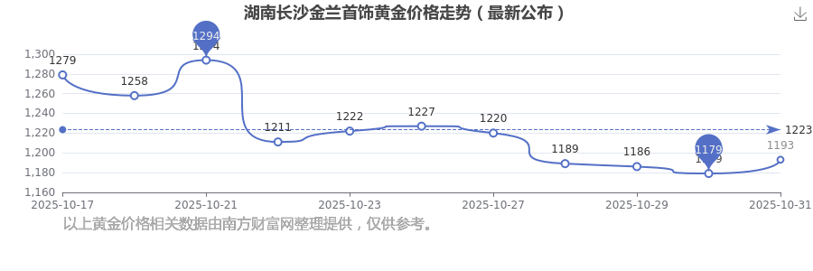 今日(2025年11月2日),湖南長沙金蘭首飾黃金價格的定價為 1193.0元/克。
