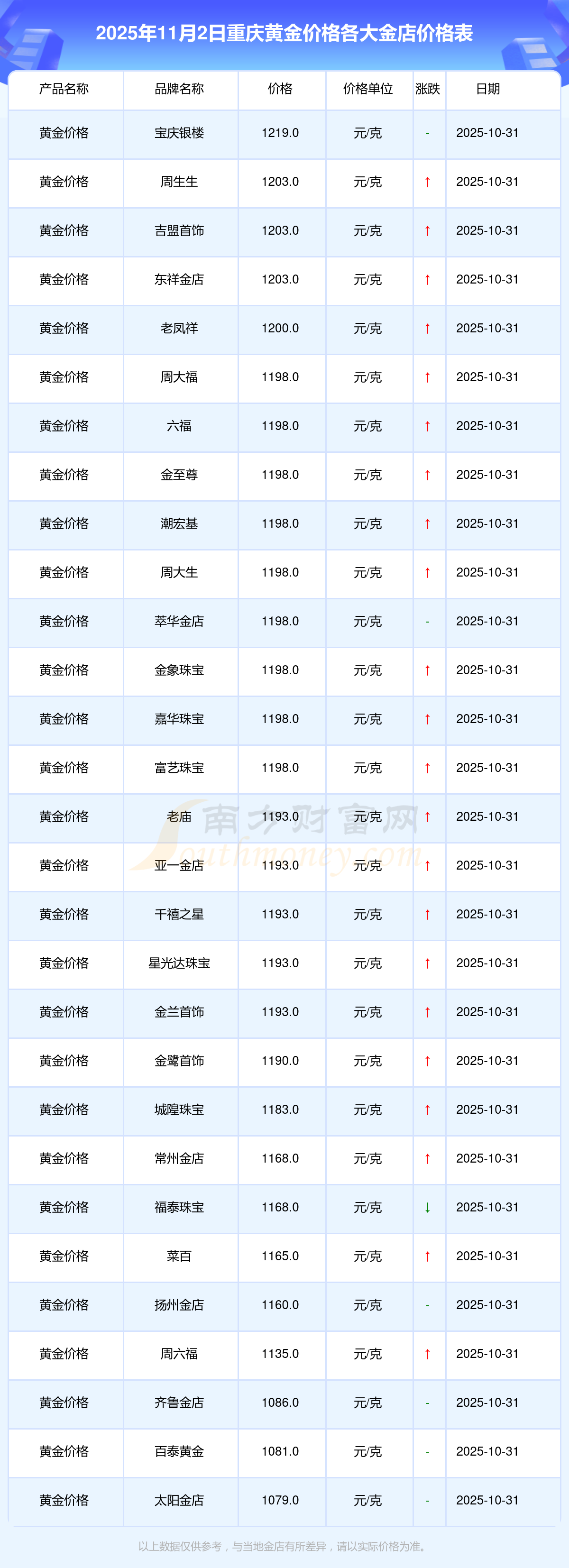 2025年11月2日,重慶周大福、周大福、周大福、周大福、周大福、周大福、周大福、老鳳祥、老鳳祥、老鳳祥、周六福等各大金店品牌黃金價格今日價格行情最新來了:周大福1198.0元/克、周大福650.0元/克、周大福1198.0元/克、周大福44660.0、周大福18640.0、周大福40080.0、周大福1058.0元/克、老鳳祥1200.0元/克、老鳳祥560.0元/克、老鳳祥1200.0元/克、周六福1135.0元/克。