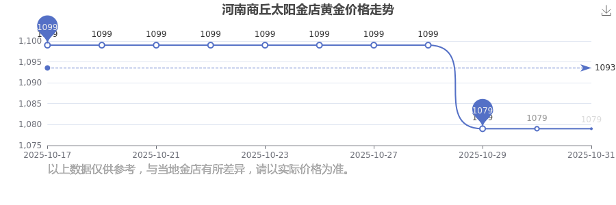 河南商丘太陽金店黃金價格在 2025年11月2日,其市場價格為 1079.0元/克。