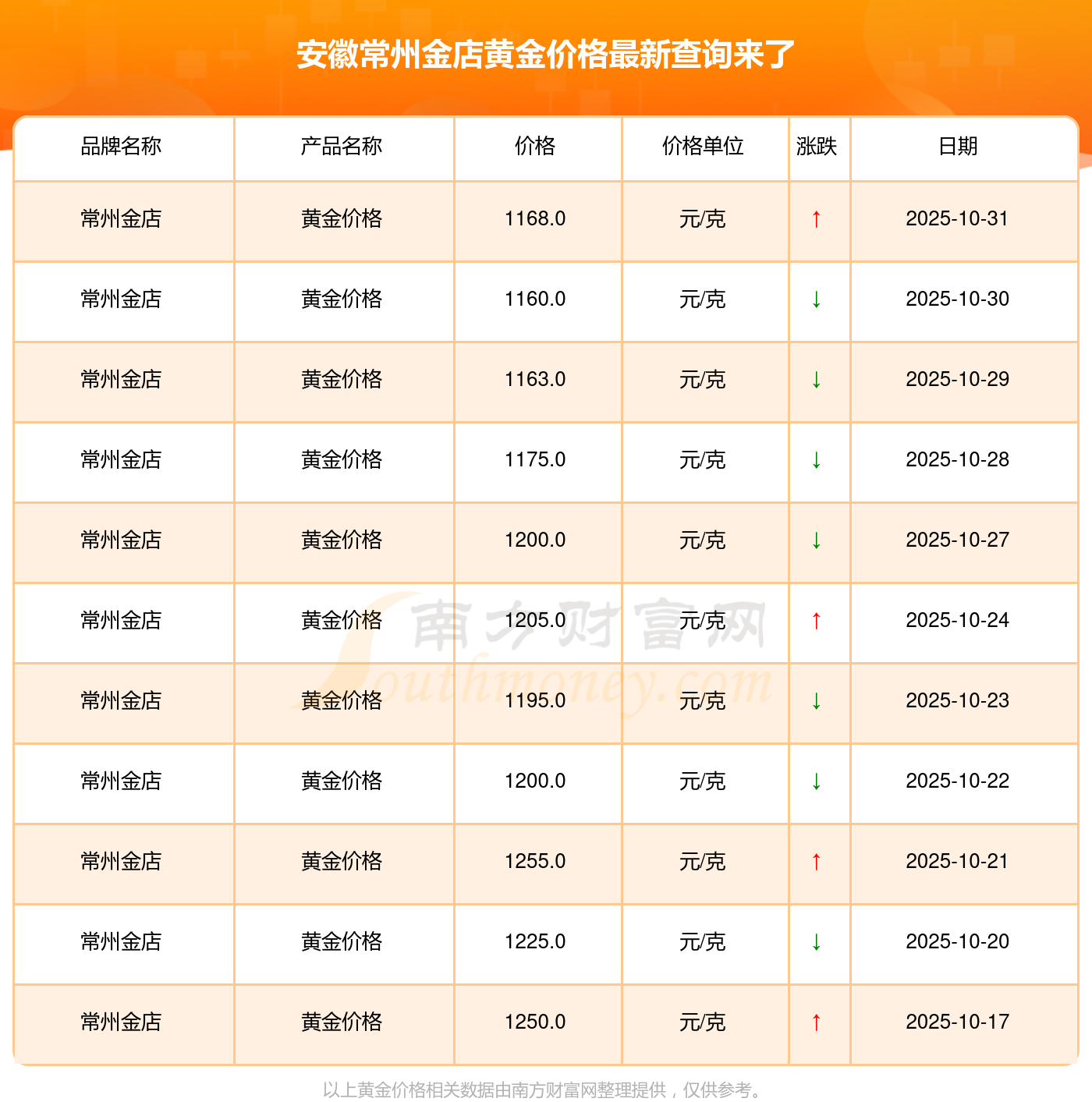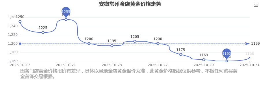 今日(2025年11月2日)安徽常州金店黃金價格:1168.0元/克。