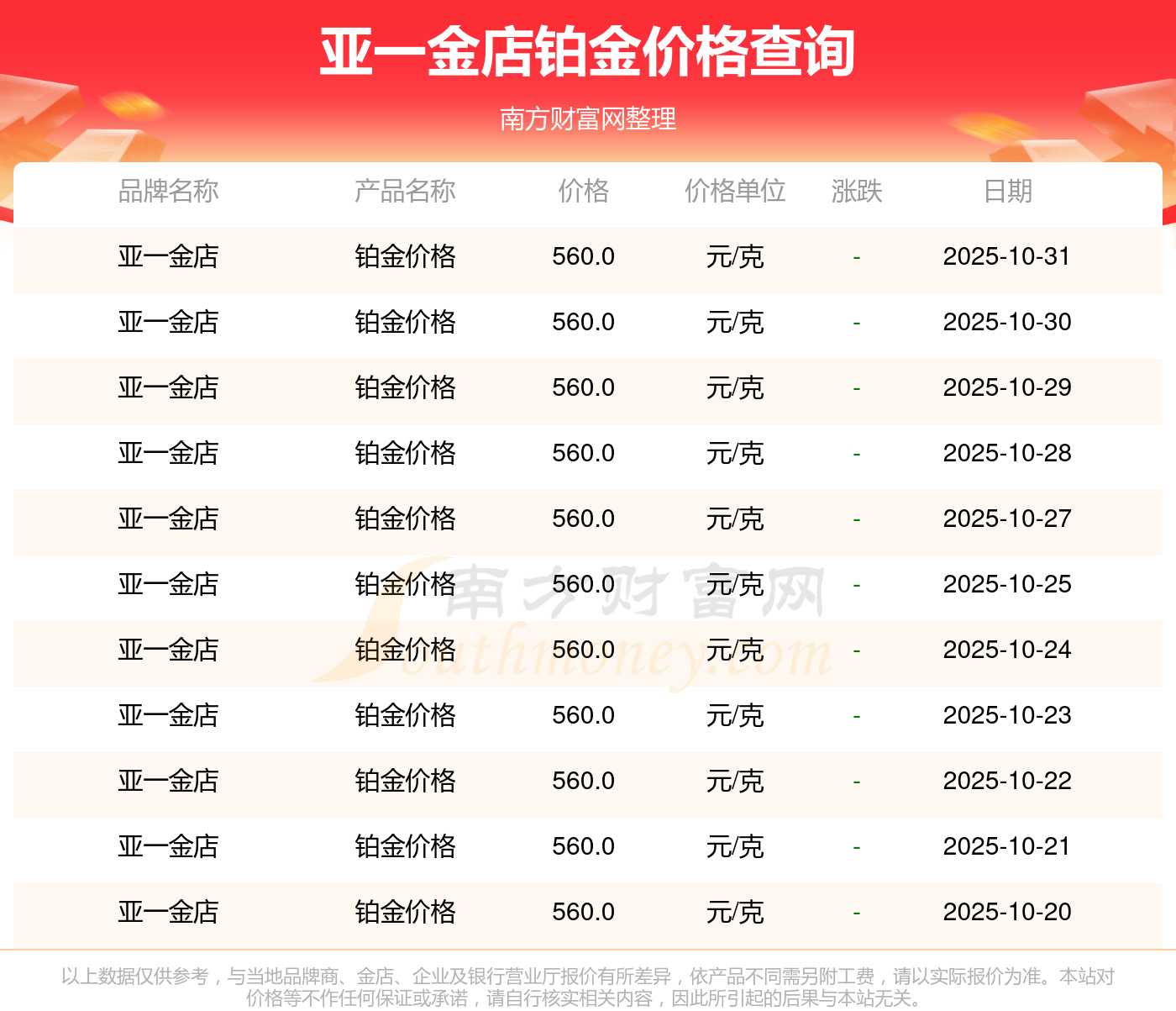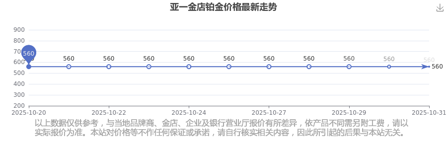 亞一金店 鉑金價格今日最新的價位是560.0元/克。