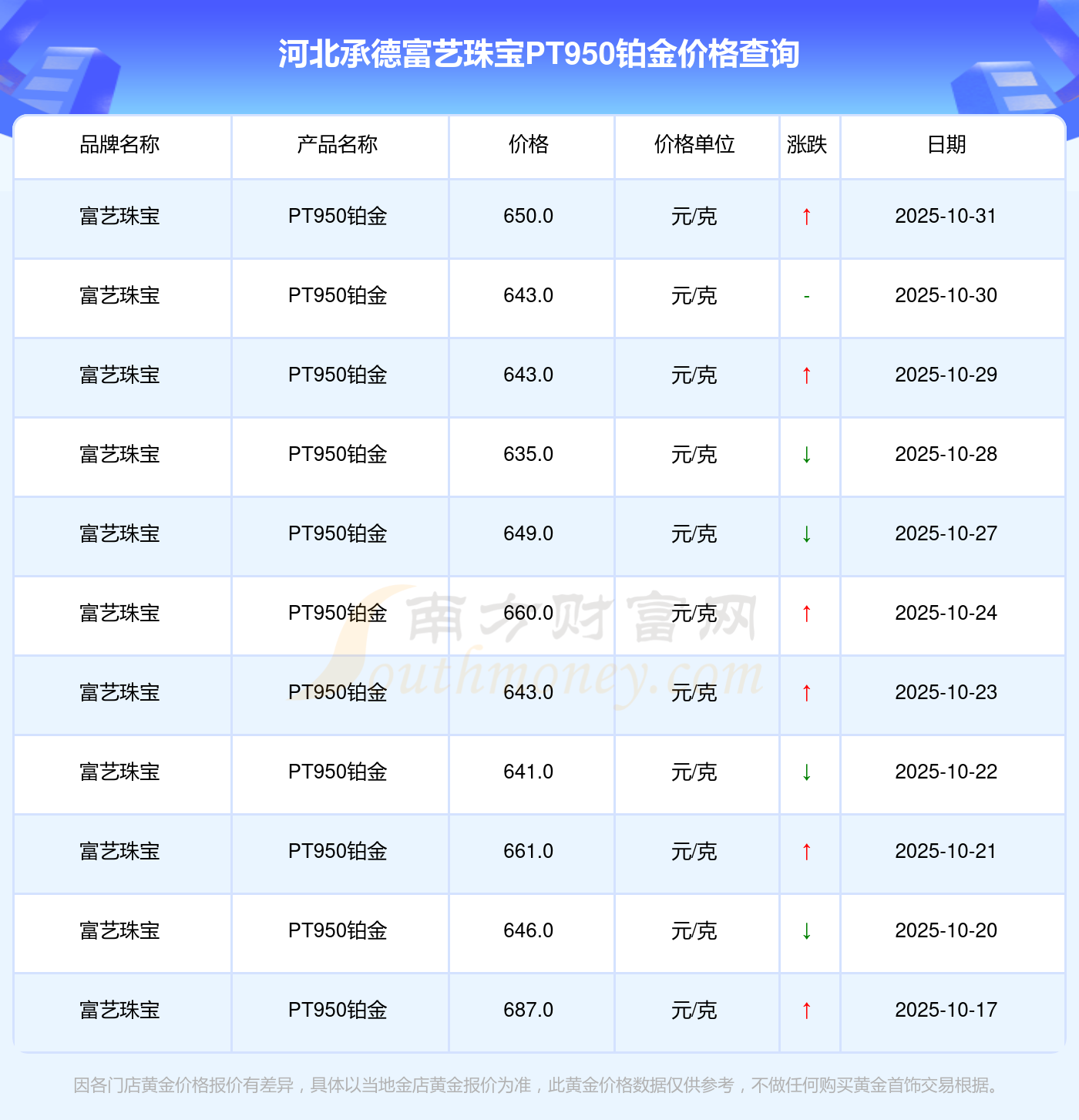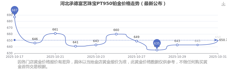 650.0元/克,這是河北承德富藝珠寶于 2025年11月2日所定的PT950鉑金價(jià)格。