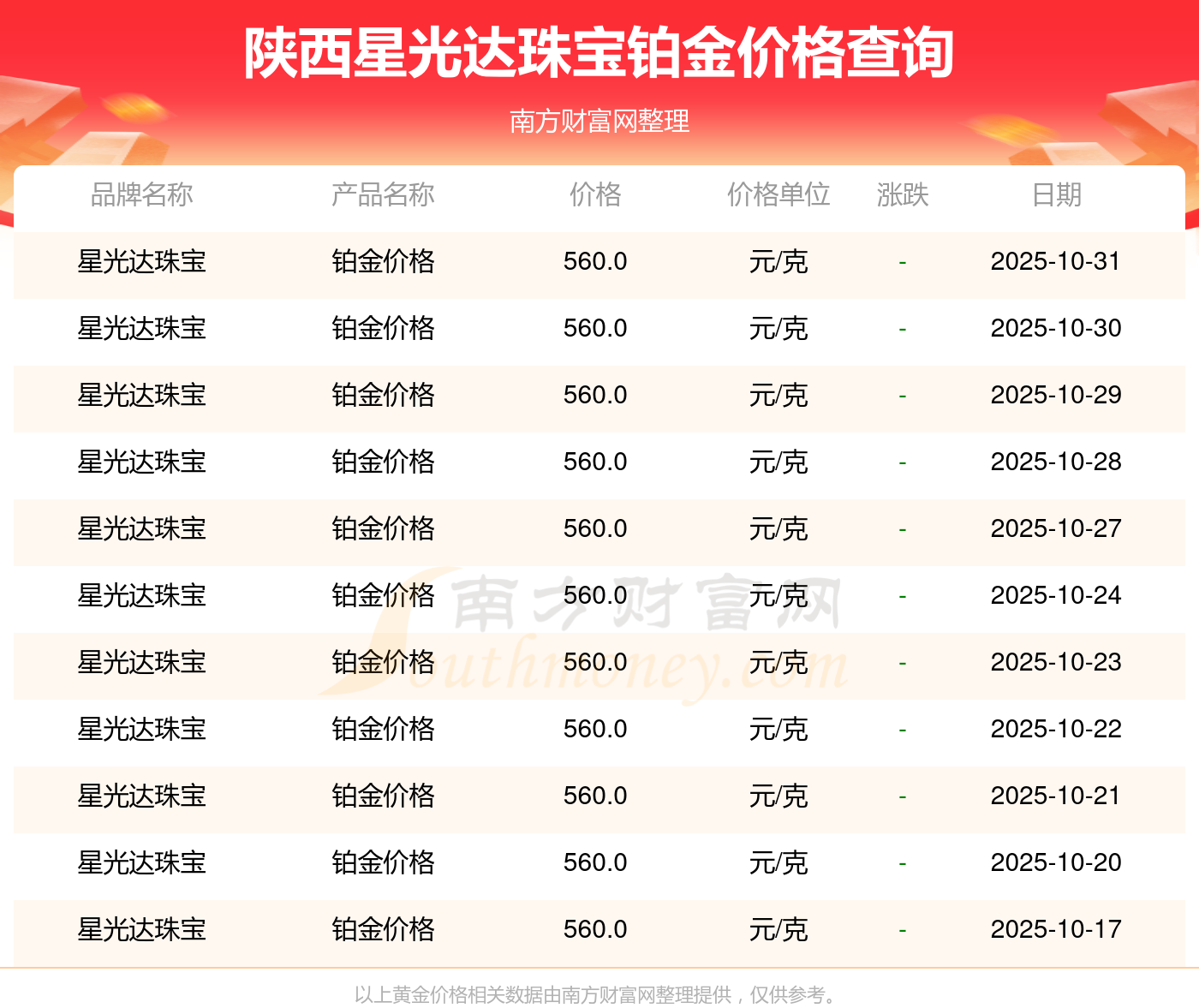 2025年11月2日陜西星光達(dá)珠寶鉑金價(jià)格為560.0元/克。
