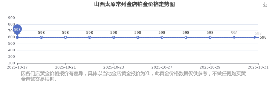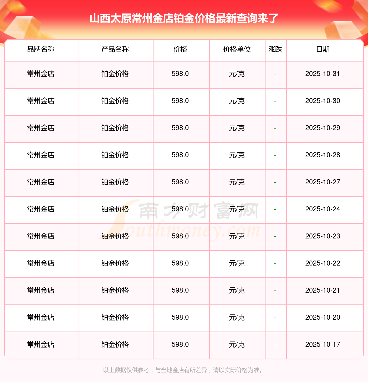 (2025年11月2日)今日山西太原常州金店鉑金價格是598.0元/克。