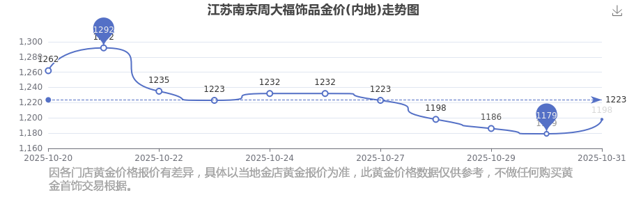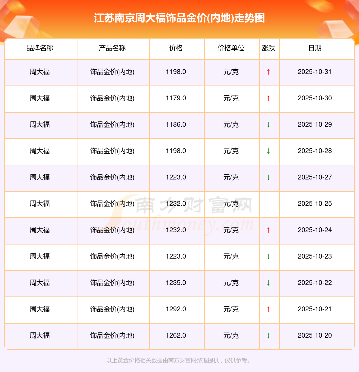 江蘇南京周大福的飾品金價(jià)(內(nèi)地)在今日(2025年11月2日),每克售價(jià)為1198.0元/克。