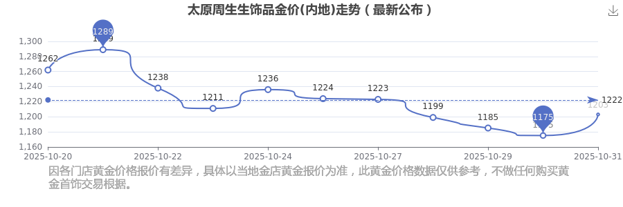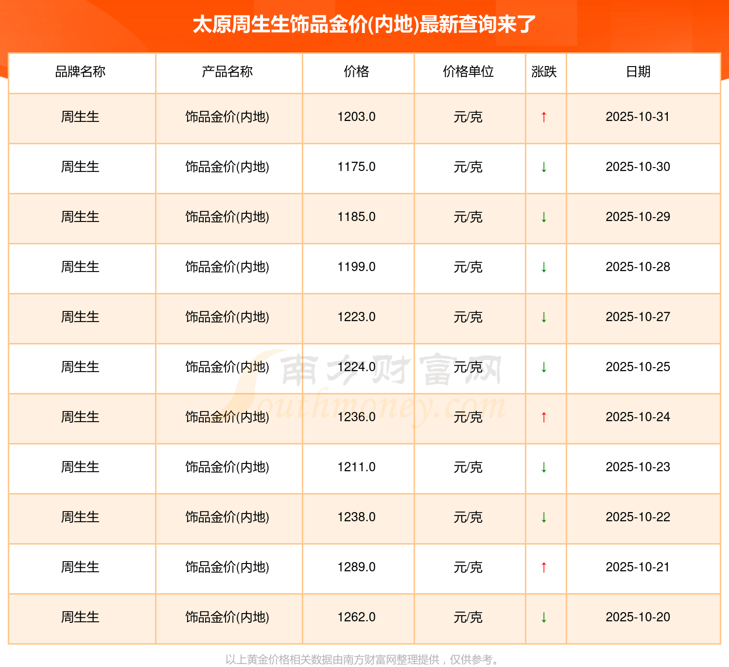 今日2025年11月2日,太原周生生飾品金價(內(nèi)地)為1203.0元/克。