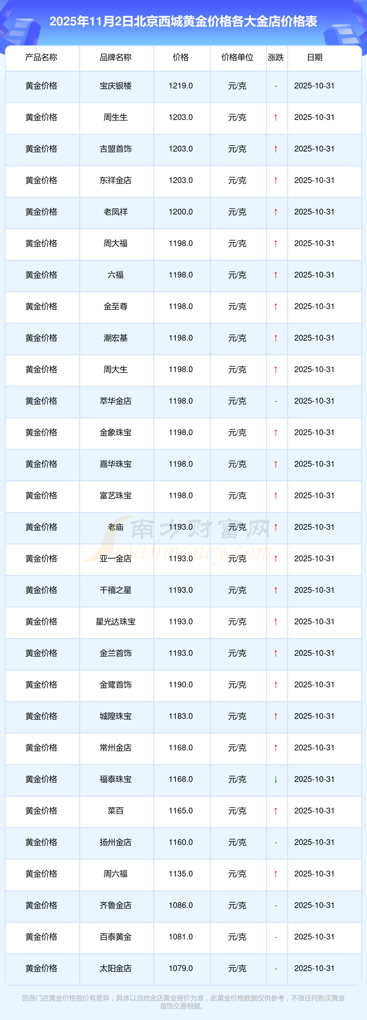 今天是2025年11月2日,北京西城周大福、周大福、周大福、周大福、周大福、周大福、周大福、老鳳祥、老鳳祥、老鳳祥、周六福等各大金店品牌黃金價格最新價格如下:周大福1198.0元/克、周大福650.0元/克、周大福1198.0元/克、周大福44660.0、周大福18640.0、周大福40080.0、周大福1058.0元/克、老鳳祥1200.0元/克、老鳳祥560.0元/克、老鳳祥1200.0元/克、周六福1135.0元/克。