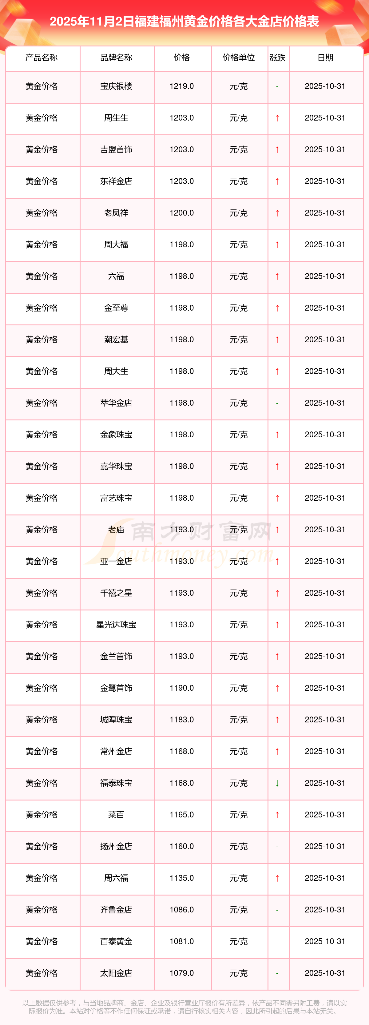 2025年11月2日,福建福州周大福、周大福、周大福、周大福、周大福、周大福、周大福、老鳳祥、老鳳祥、老鳳祥、周六福等各大金店品牌黃金價(jià)格今日價(jià)格行情最新來(lái)了:周大福1198.0元/克、周大福650.0元/克、周大福1198.0元/克、周大福44660.0、周大福18640.0、周大福40080.0、周大福1058.0元/克、老鳳祥1200.0元/克、老鳳祥560.0元/克、老鳳祥1200.0元/克、周六福1135.0元/克。