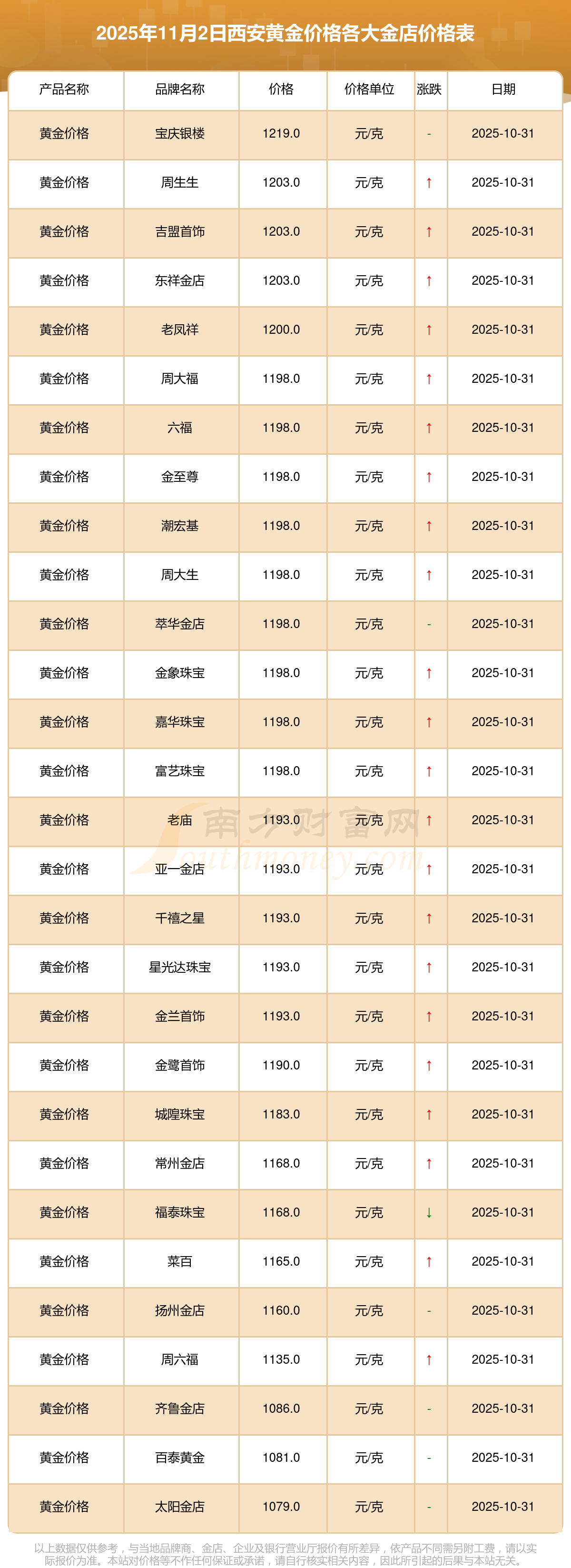 2025年11月2日西安周大福、周大福、周大福、周大福、周大福、周大福、周大福、老鳳祥、老鳳祥、老鳳祥、周六福等各大金店品牌黃金價格最新價格如下:周大福黃金價格1198.0元/克,周大福鉑金價格650.0元/克,周大福飾品金價(內(nèi)地)1198.0元/克,周大福黃金飾品(香港)44660.0,周大福鉑金價格(香港)18640.0,周大福金條價格(香港)40080.0,周大福金條金價(內(nèi)地)1058.0元/克,老鳳祥黃金價格1200.0元/克,老鳳祥鉑金價格560.0元/克,老鳳祥足金價格1200.0元/克,周六福黃金價格1135.0元/克。
