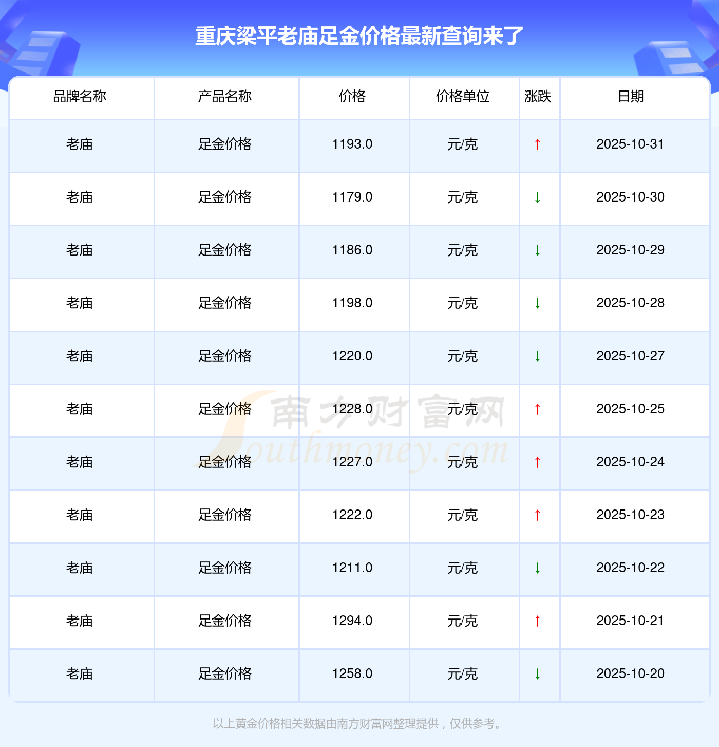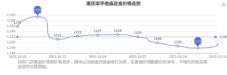 今日(2025年11月2日),重慶梁平老廟足金價(jià)格的價(jià)格是1193.0元/克。