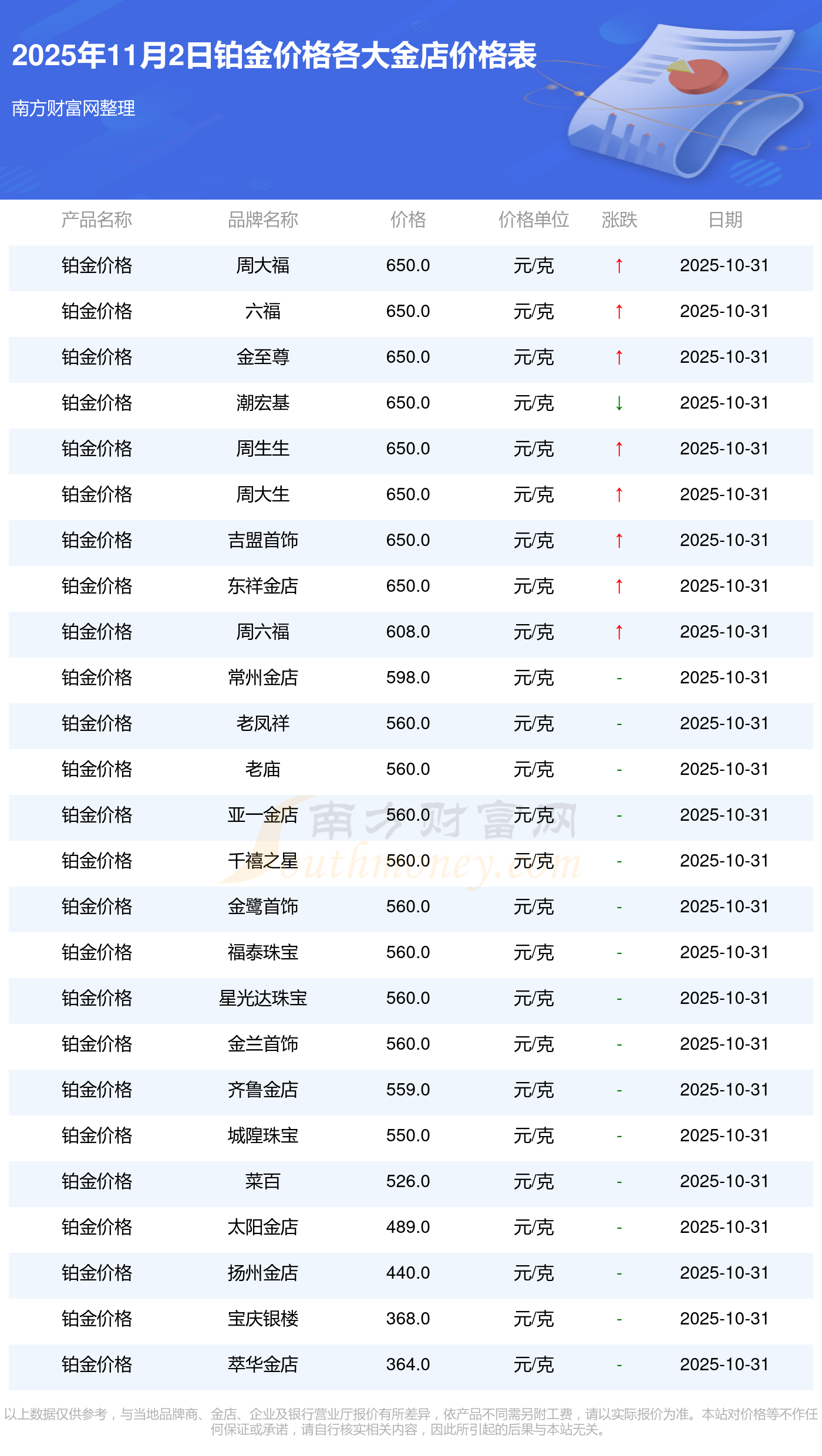 2025年11月2日周大福、周大福、周大福、周大福、周大福、周大福、周大福、老鳳祥、老鳳祥、老鳳祥、周六福等各大金店品牌鉑金價格最新價格如下:周大福黃金價格1198.0元/克,周大福鉑金價格650.0元/克,周大福飾品金價(內(nèi)地)1198.0元/克,周大福黃金飾品(香港)44660.0,周大福鉑金價格(香港)18640.0,周大福金條價格(香港)40080.0,周大福金條金價(內(nèi)地)1058.0元/克,老鳳祥黃金價格1200.0元/克,老鳳祥鉑金價格560.0元/克,老鳳祥足金價格1200.0元/克,周六福黃金價格1135.0元/克。