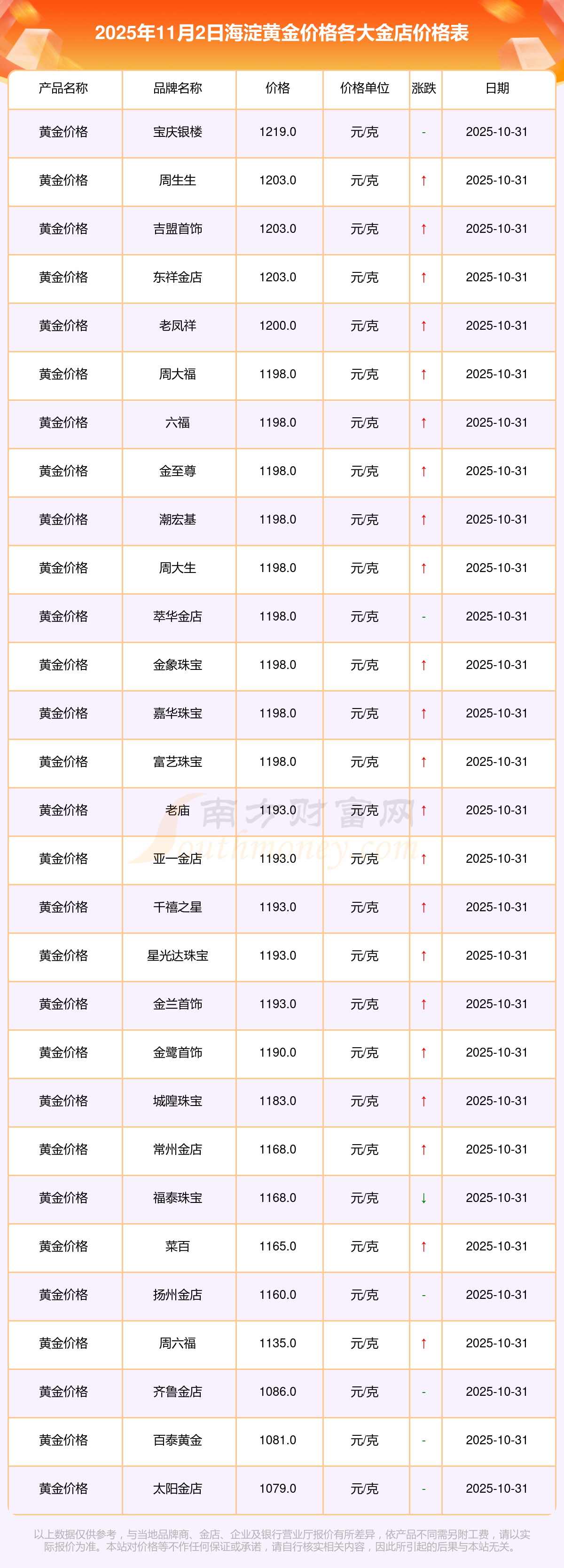 2025年11月2日海淀周大福、周大福、周大福、周大福、周大福、周大福、周大福、老鳳祥、老鳳祥、老鳳祥、周六福等各大金店品牌黃金價格最新價格行情來了,如下:周大福黃金價格1198.0元/克,周大福鉑金價格650.0元/克,周大福飾品金價(內(nèi)地)1198.0元/克,周大福黃金飾品(香港)44660.0,周大福鉑金價格(香港)18640.0,周大福金條價格(香港)40080.0,周大福金條金價(內(nèi)地)1058.0元/克,老鳳祥黃金價格1200.0元/克,老鳳祥鉑金價格560.0元/克,老鳳祥足金價格1200.0元/克,周六福黃金價格1135.0元/克。