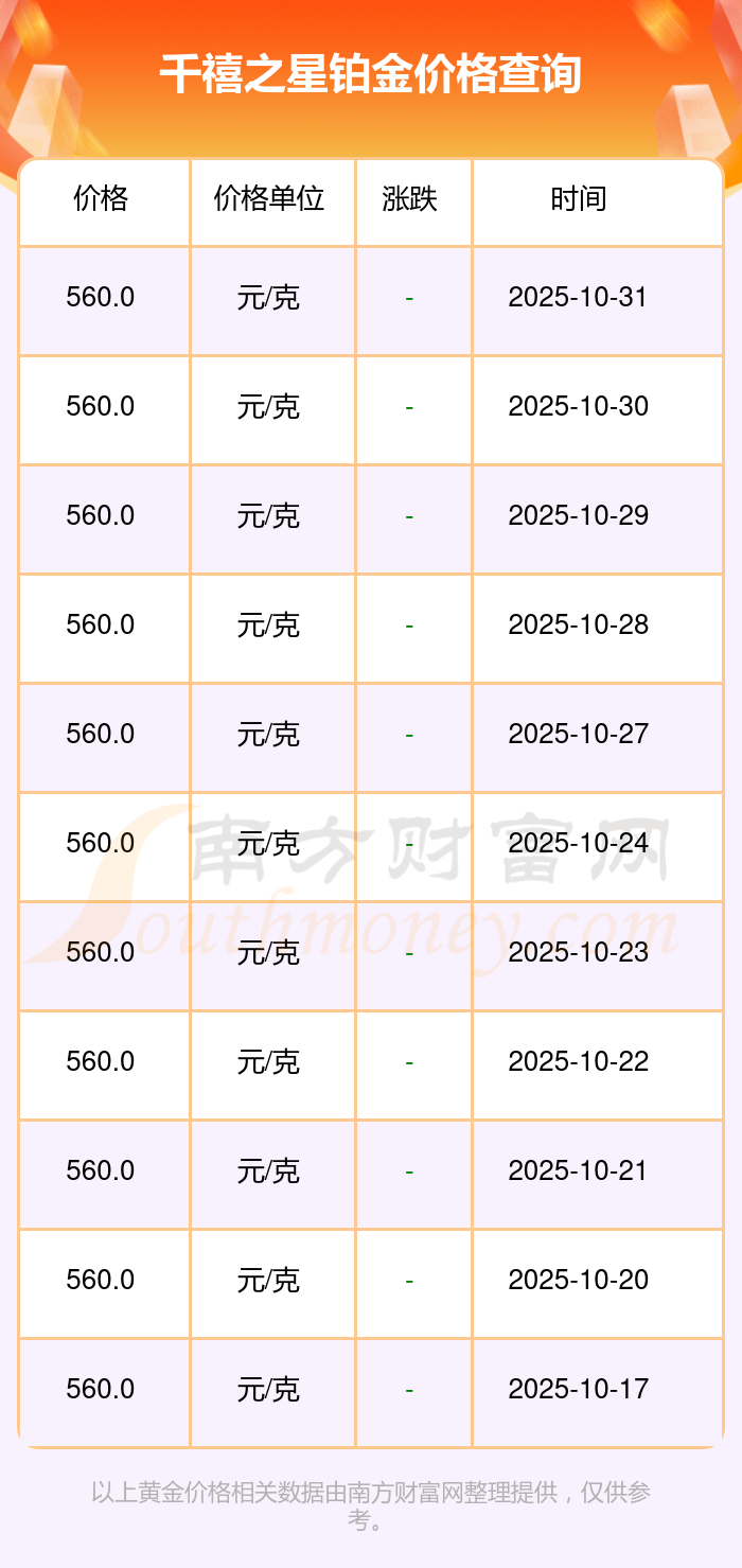 千禧之星今日 鉑金價格的最新市場行情價為560.0元/克。