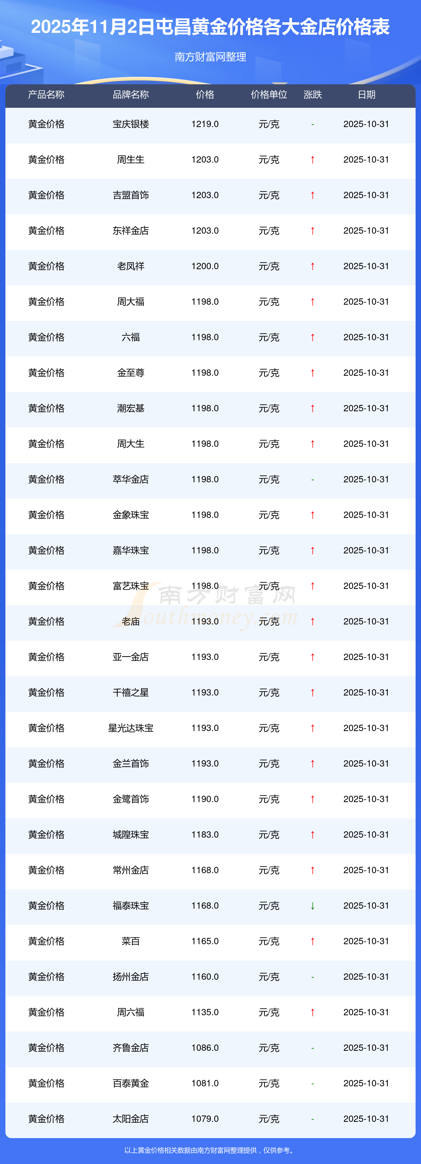 今天是2025年11月2日,屯昌周大福、周大福、周大福、周大福、周大福、周大福、周大福、老鳳祥、老鳳祥、老鳳祥、周六福等各大金店品牌黃金價(jià)格最新價(jià)格行情是這樣的:周大福1198.0元/克、周大福650.0元/克、周大福1198.0元/克、周大福44660.0、周大福18640.0、周大福40080.0、周大福1058.0元/克、老鳳祥1200.0元/克、老鳳祥560.0元/克、老鳳祥1200.0元/克、周六福1135.0元/克。
