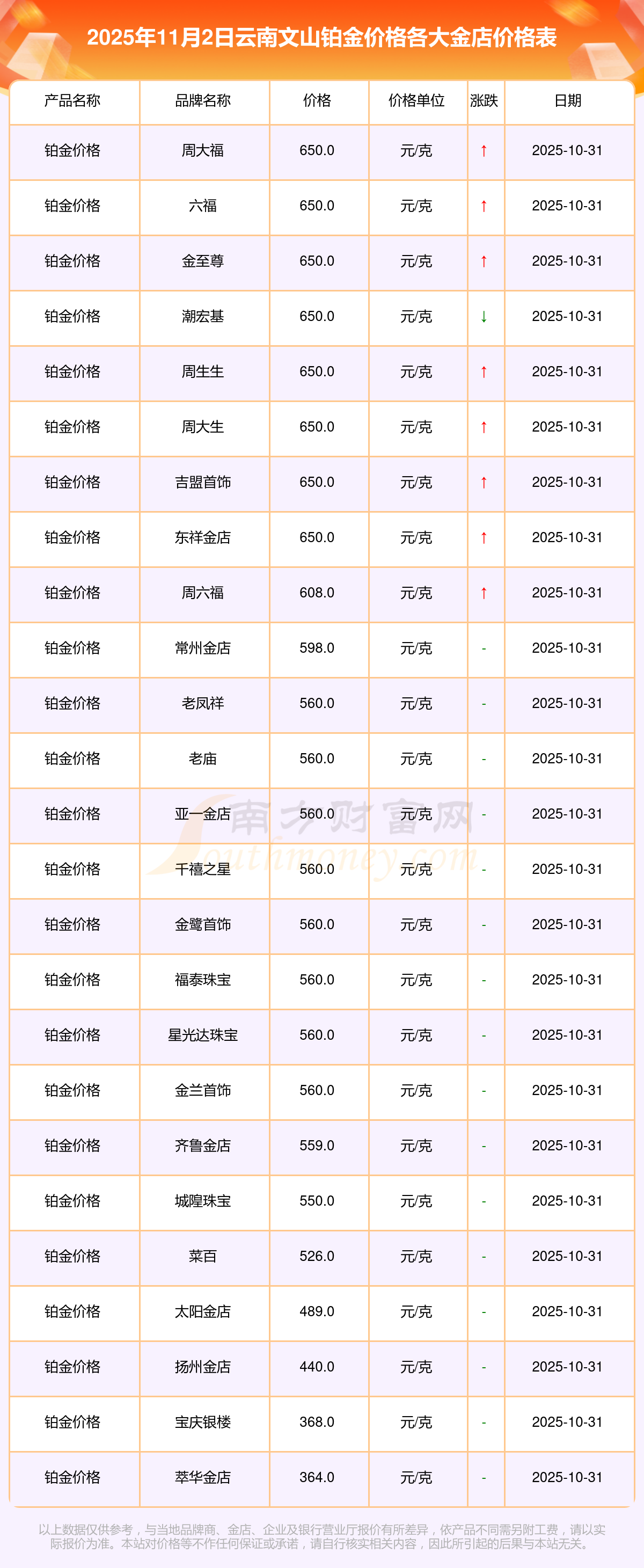 2025年11月2日,云南文山周大福、周大福、周大福、周大福、周大福、周大福、周大福、老鳳祥、老鳳祥、老鳳祥、周六福等各大金店品牌鉑金價(jià)格今日價(jià)格行情最新來了:周大福1198.0元/克、周大福650.0元/克、周大福1198.0元/克、周大福44660.0、周大福18640.0、周大福40080.0、周大福1058.0元/克、老鳳祥1200.0元/克、老鳳祥560.0元/克、老鳳祥1200.0元/克、周六福1135.0元/克。