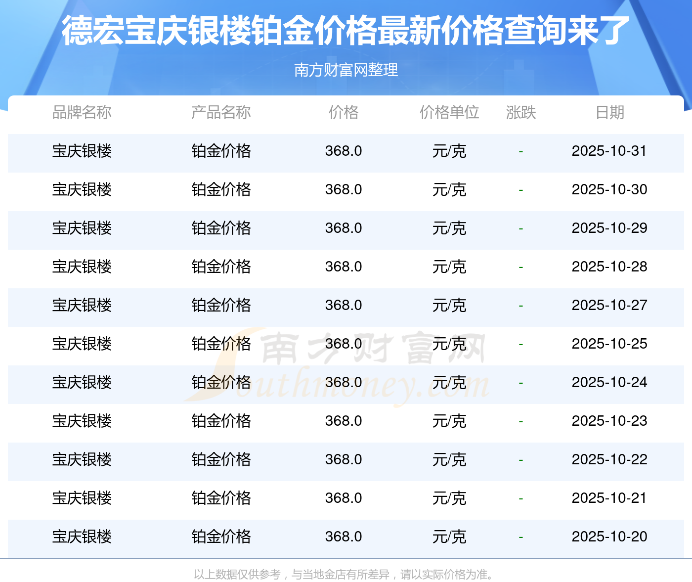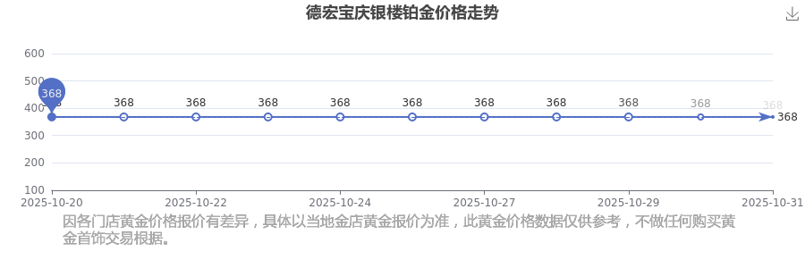 德宏寶慶銀樓現(xiàn)在鉑金價(jià)格多少錢1克,此刻黃金一克的價(jià)格是多少?今日德宏寶慶銀樓鉑金價(jià)格查詢,今日德宏寶慶銀樓鉑金價(jià)格為368.0元/克。